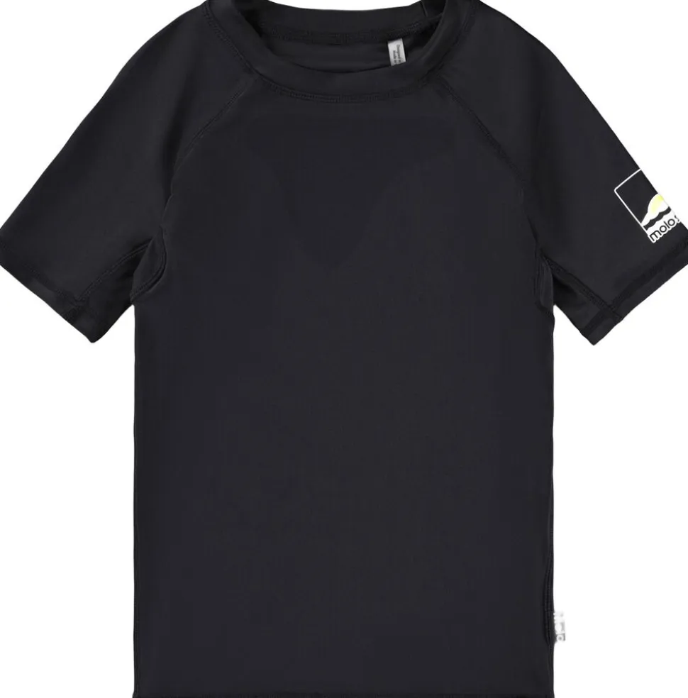 Badet-shirten til børn er designet til aktive legesyge sjæle. Fremstillet af genanvendt polyester, giver den UV50+ beskyttelse mod solens stråler. Den tætsiddende pasform med opretstående krave og korte raglanærmer sikrer, at dit barn kan bevæge sig frit og komfortabelt ved både strand og pool. Materialet er strækbart og let, ideelt til sommerens leg.