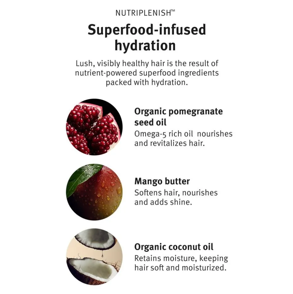 En vegansk balsam med et superfood-kompleks, der giver næring og friskere hår. Rig på fugt med en avanceret formel med 96 % naturlige ingredienser. Mangosmør med fedtsyrer, der giver næring og gør håret blødt og smidigt. I Deep-produkterne er der 50 % mere mangosmør end i Light-produkterne for at give maksimal fugt. Økologisk granatæbleolie er rigt på omega 5 og er ultimativt til tørt og livløst hår. Certificeret kokosolie trænger ind i hårstråene og tilfører fugt. Passer til tørt og meget tørt hår.