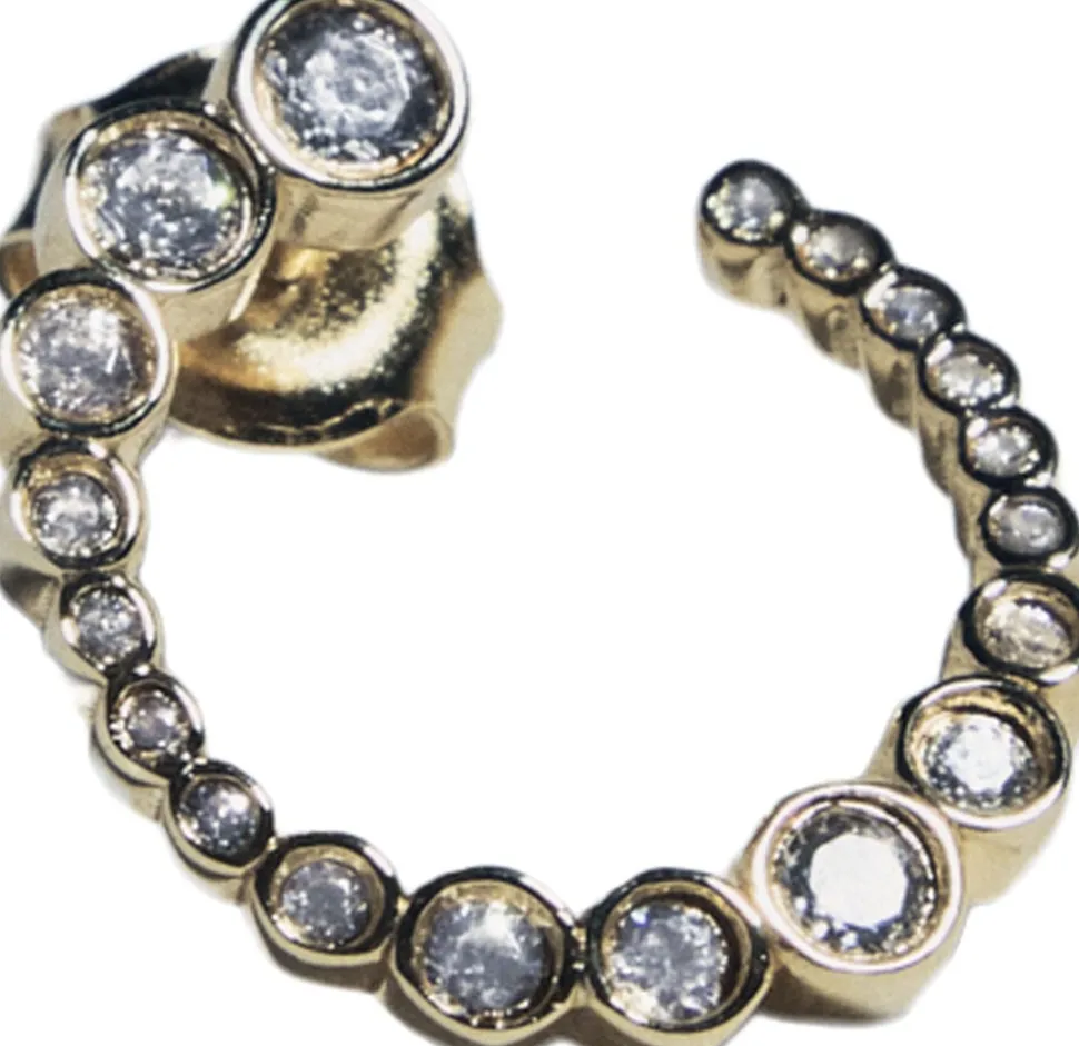 Et par afrundede øreringe med en række skinnende CZ-sten i forskellige størrelser, der går fra forsiden af øret, ned i en rund cirkel og slutter bag øret.