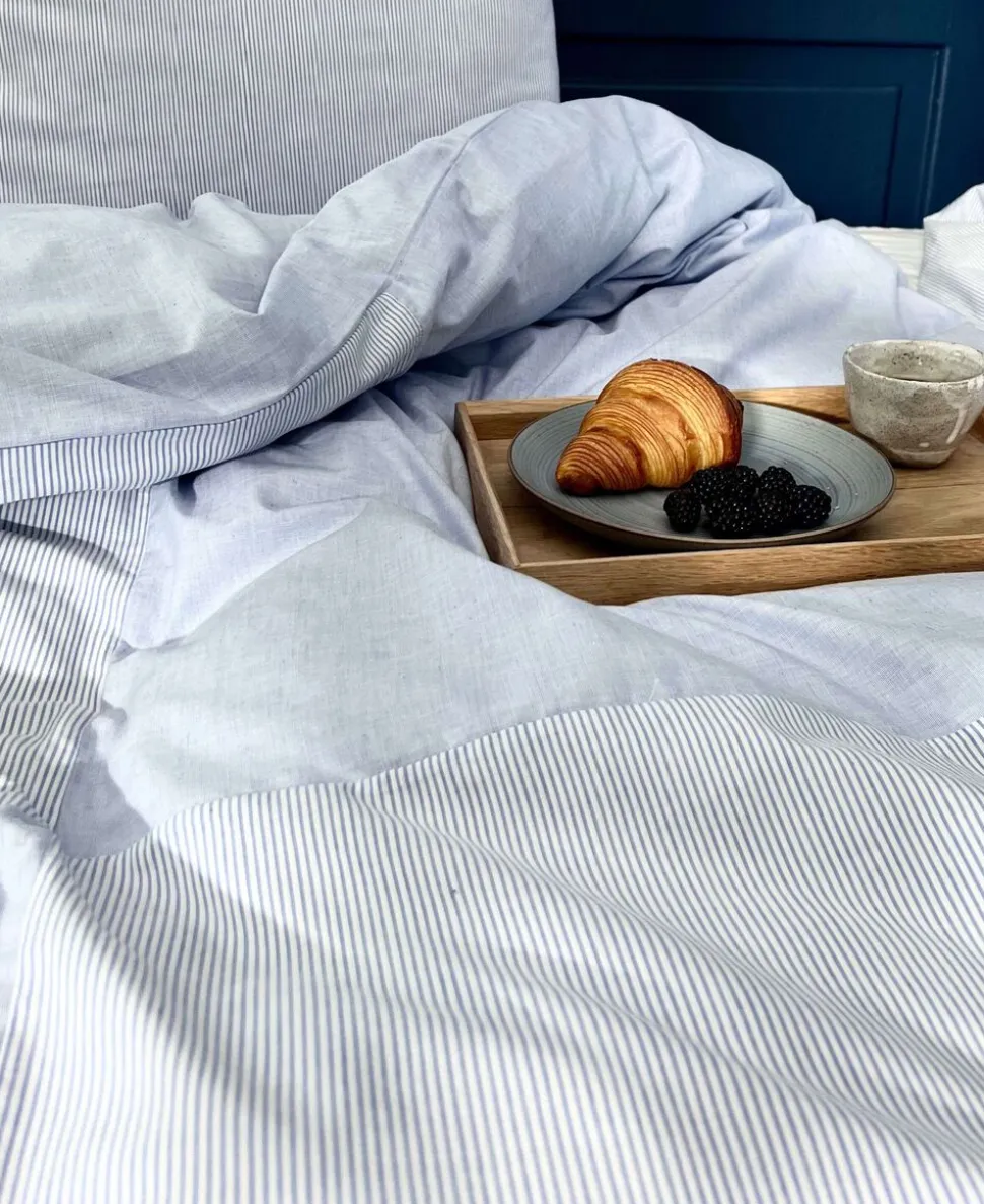 OMHU MINI STRIB PATCHWORK SENGELINNED Sengesættet er fremstillet i en ekstra lækker Renforcé lærredsvævning i 100% økologisk bomuld TC 144. Renforcéen giver en meget glat overflade, der vil gengive farverne meget flot. Sengesættet er designet som patchwork og sammensyet af fire felter på fronten i en kombination af den klassiske smalle strib og meleret Chambre, som også udgør den modsatte side. Dette giver flere kombinationsmuligheder på en flot opredning. Perfekt for dig der ønsker et roligt design og god samvittighed.