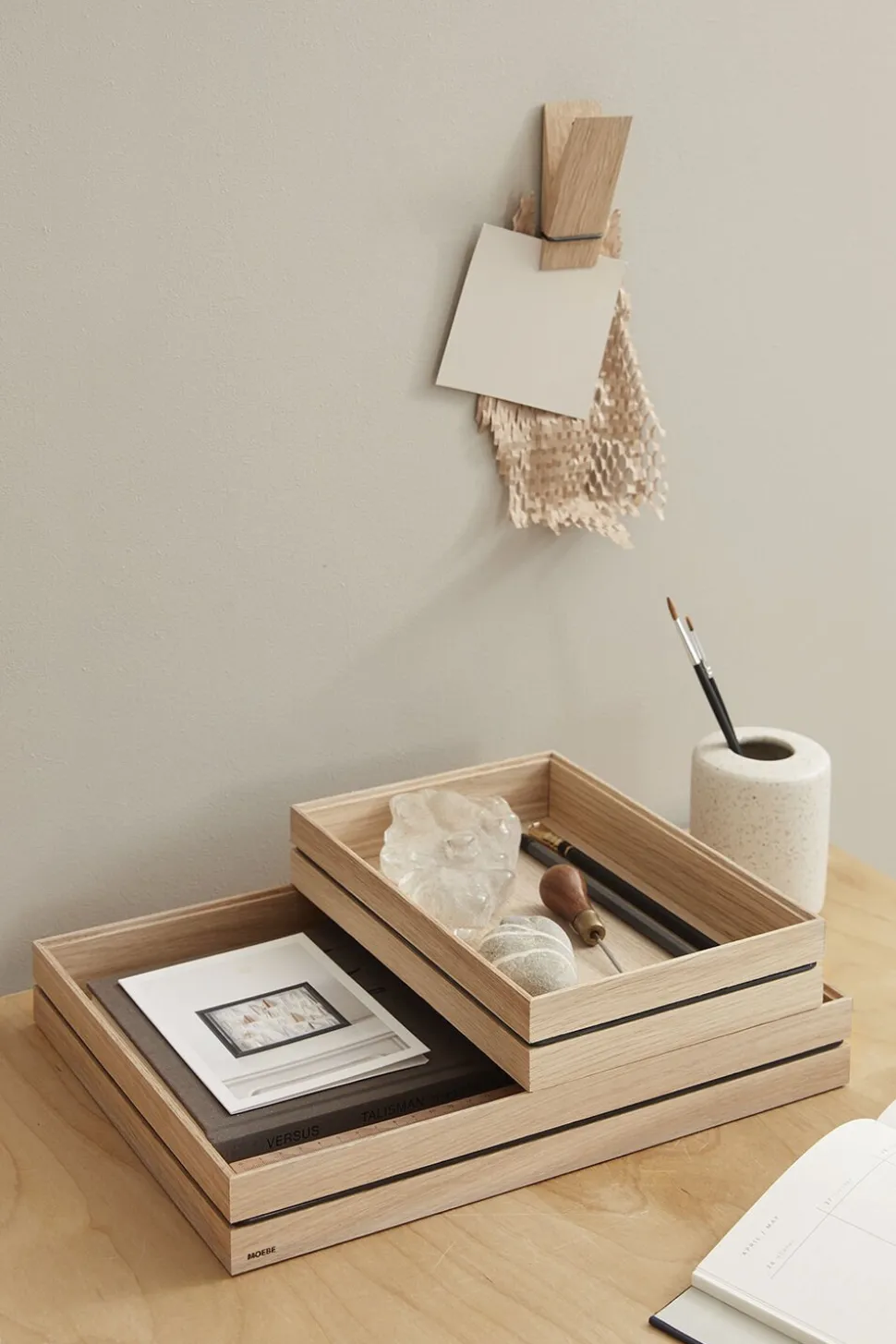 Each Organise is made of solid untreated oak and is held together by a single rubber band. Available in A4 and A5. Each size is stackable and compatible with the other. Works alone or combined together.
