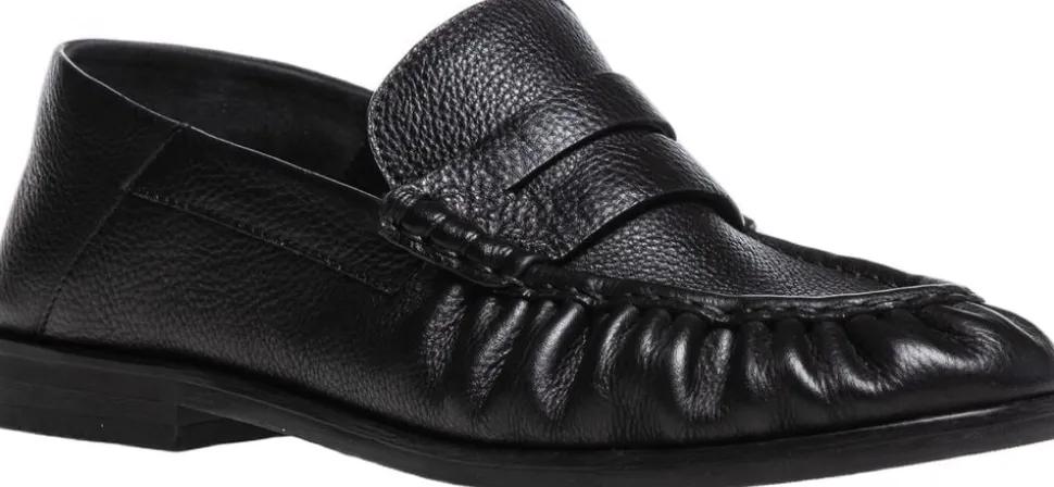 En moderne loafer i sort blødt skind med elegante rynkede detaljer, der giver modellen et feminint og unikt udtryk. Den glatte penny-strap på vristen fuldender det stilrene design, som både er klassisk og trendy. Den fleksible og slidstærke TPU-sål kombineret med den bløde Copenhagenshoes foam indersål sikrer komfort hele dagen.