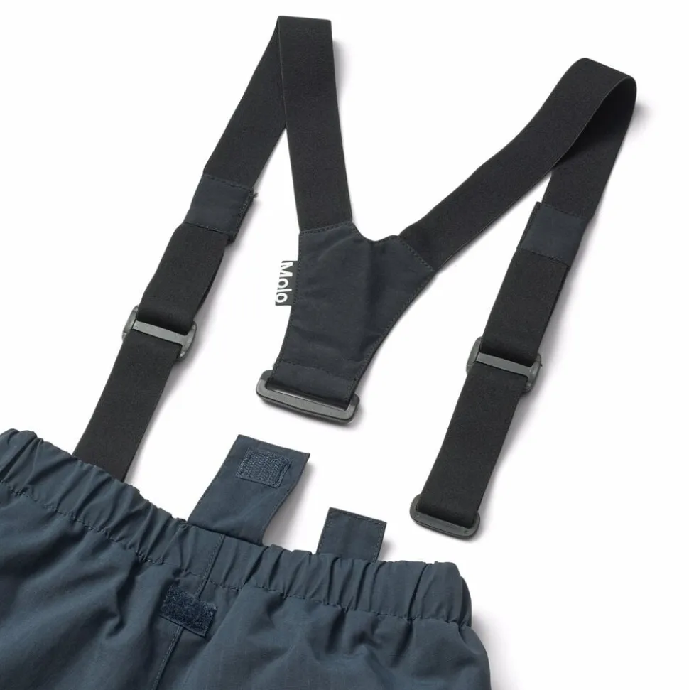 Disse mørkeblå overtræksbukser fra Molo er lavet i genanvendt nylon. Bukserne har elastik i taljen, justerbar elastik indvendigt, bæltestropper til Molos seler (ekstra tilbehør) og justerbar benåbning med snefang. Desuden er bukserne udstyret med en stor refleks bagpå.
