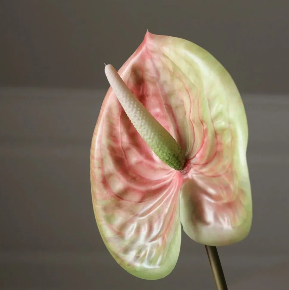 Denne Pink Medium Anthurium Flower har en Single bred, hjerteformet blomst med en blanding af bløde lyserøde og grønne nuancer. Overfladen af den petal-lignende spathe er lidt kruset, fremvisning naturlige farvevariationer. En tekstureret, lysegrøn spadix strækker sig fra midten og supplerer blomsternes gradienttoner. Blomsten understøttes af et buet, glat grønt skaft, der måler 54 cm i højden. Den store keramiske jordvase på billedet måler 30,5 cm i højden og 10 cm i diameter.