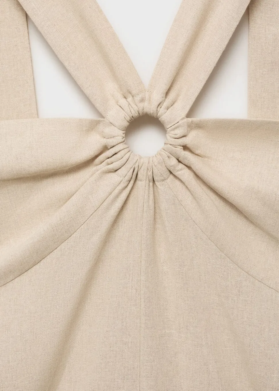 Hørblanding, 100 % bomuldsfor, kort Design, lige Design, V-hals, rammedetalje på halsudskæringen, uden ærmer, brede stropper, elastisk rynkede paneler bagpå, lynlåslukning bagpå.