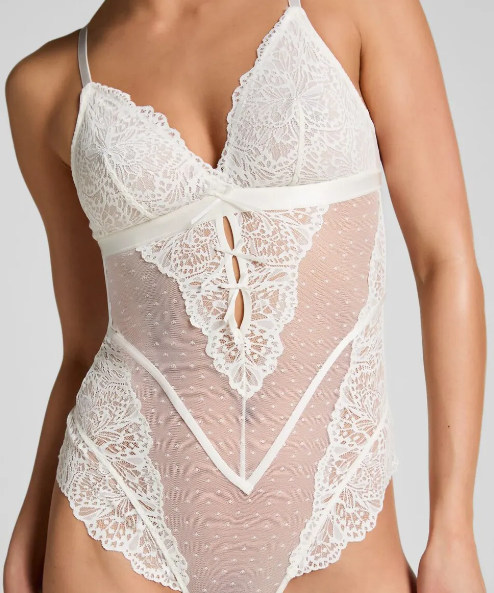 Charmér i denne smukke body, der er fremstillet af meshstof og prydet med blondedetaljer ved halsudskæringen og i siderne. Dekorative sløjfer tilføjer et flot touch.