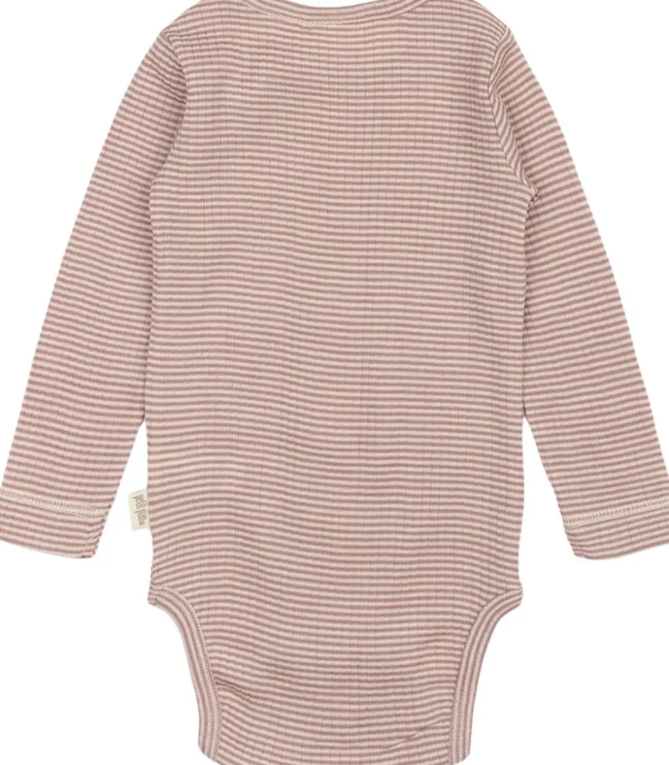 Langærmet body lavet i merinouldskvalitet med smukke striber. I venstre side af halsåbningen har vi vores signaturlukning med en trykknap for nem åbning. Bodyen lukkes i bunden med tre trykknapper, for nem ble-skift. Materiale er blødt og meget strækbart, lavet til komfort og leg. Produceret i Indien.