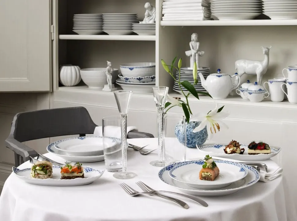 En klassiker fra det 19. århundrede, der er som skabt til vores tid. Kniplingeborten og de blå musseldekorationer på Prinsesse-stellet afslører dets tætte bånd til Royal Copenhagens musselmalede stel. Og det var faktisk også det, der i det 19. århundrede inspirerede Arnold Krog da han designede denne royale, klassiske serie af håndglaserede og håndmalede stel i en mesterlig, traditionel stil.
