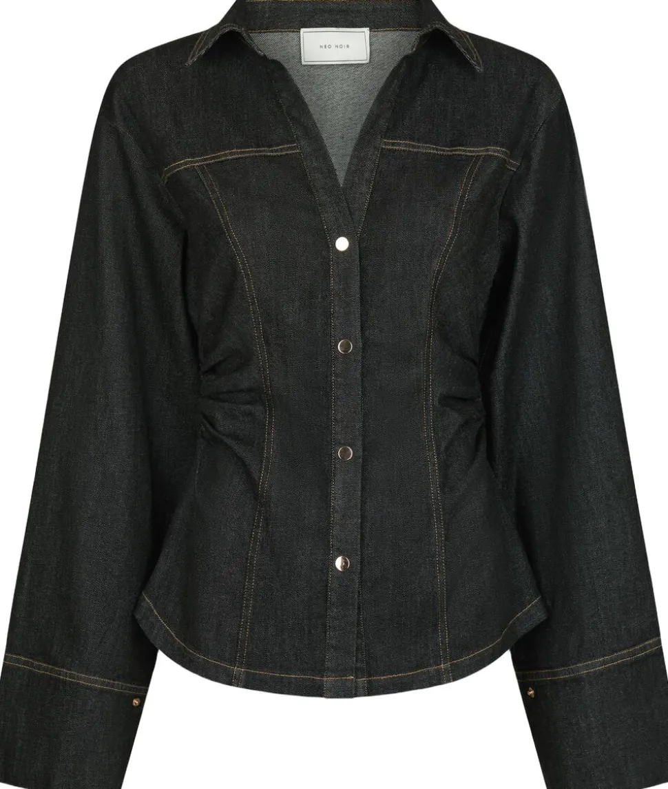 Denimskjorte med kontrastsyninger. Skjorten har en V-udskæring med krave, lange ærmer med brede manchetter og lommer foran. Den er lavet i en blød og strækbar denimkvalitet. Pasformen er tætsiddende, og modellen er iført størrelse 36.
