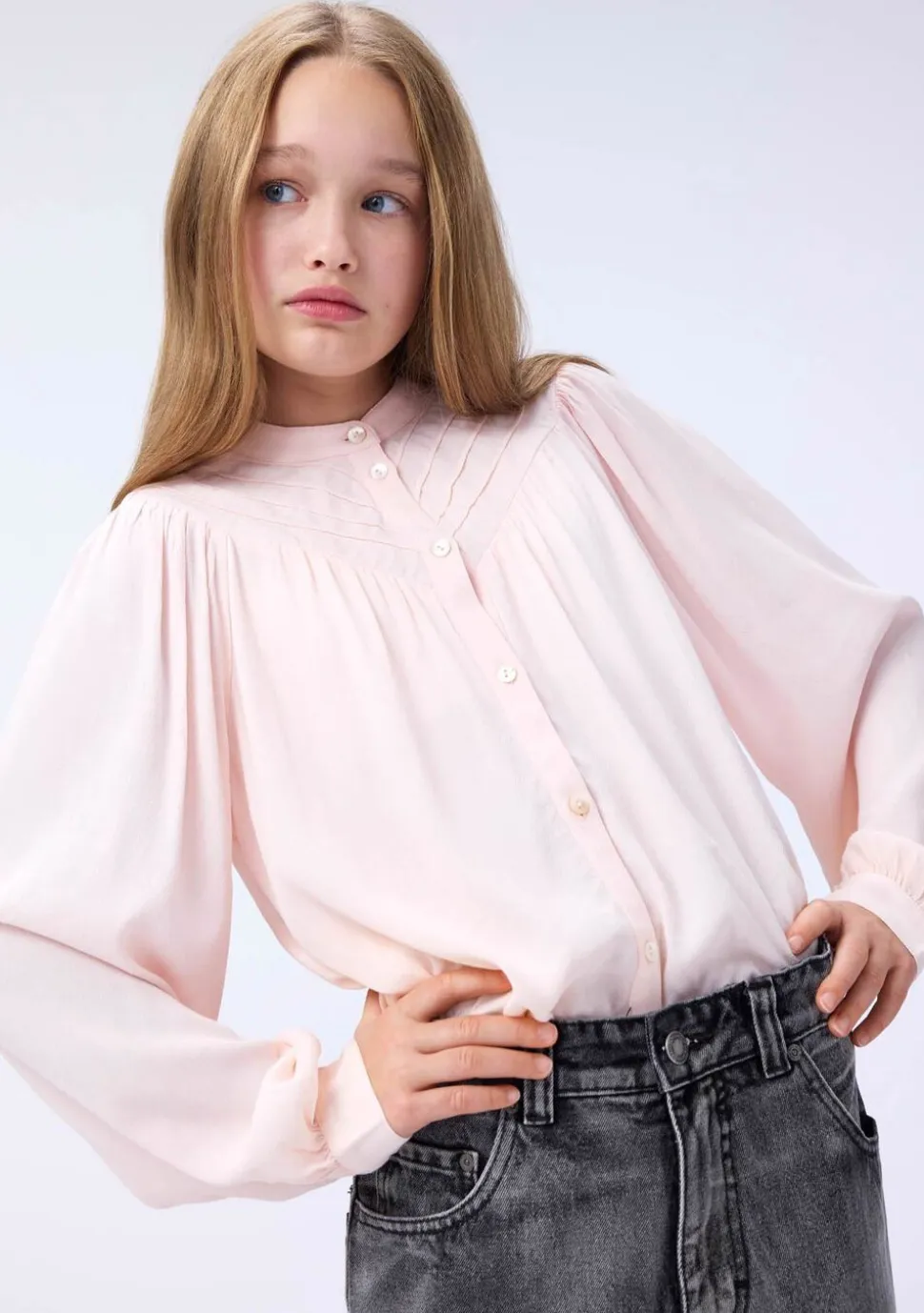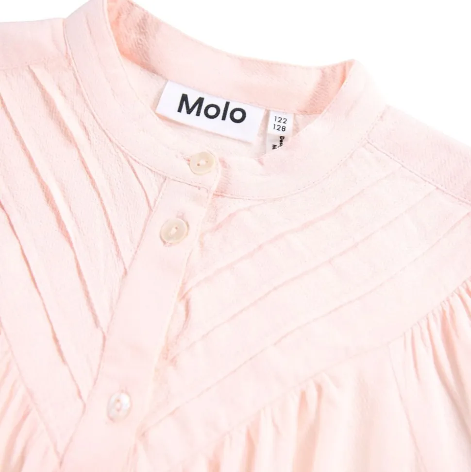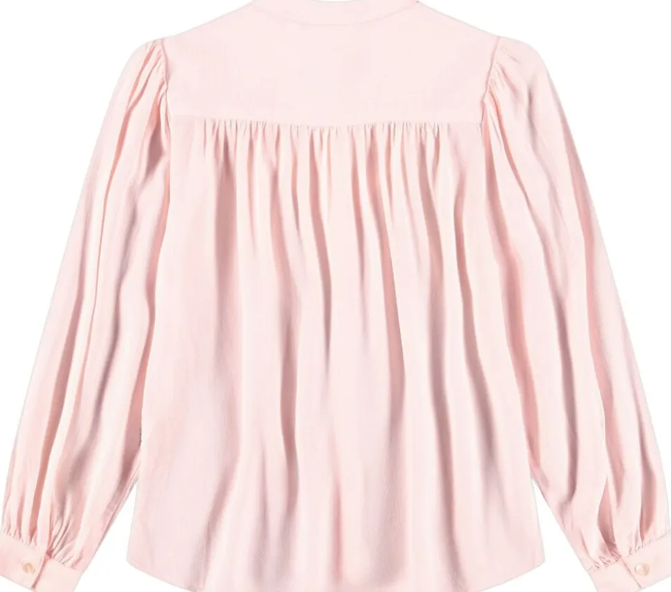 Denne lyserøde viskose skjorte fra Molo har knaplukning foran og ved ærmerne samt flotte paneler ved kraven. Skjorten har masser af rynk ved både krop og ærmer, hvilket skaber et flot fald.