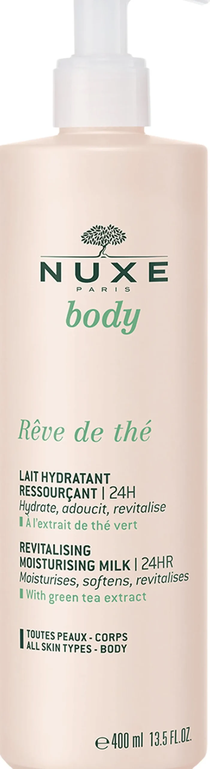 Nuxe Body Reve de The Revitalising Moisturising Milk 24 hr er en silkeagtig lotion som vil vinde dit hjerte med sin uimodståelige blødhed og opløftende duft: grøn te kombineres med et 100% sukkerkompleks med naturlig oprindelse, der giver mulighed for fugt hele døgnet *. Dens friske, smeltende struktur absorberes hurtigt, så du kan klæde dig på med det samme. Dens subtile duft giver dine sanser den genoplivende kickstart, som den har brug for hver dag.