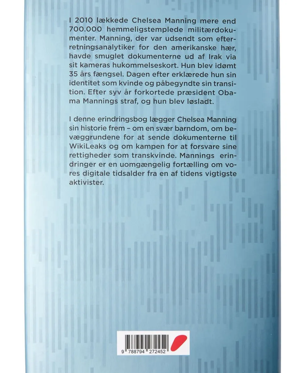 I 2010 afslørede Chelsea Manning, der arbejdede som efterretningsanalytiker i USAs hær i Irak, fortrolige militærdokumenter. Hæren idømte Manning femogtredive års militærfængsel med toogtyve anklagepunkter relateret til ulovlig besiddelse og distribution af klassificerede forsvarsdokumenter. Dagen efter domsfældelsen erklærede Manning sin kønsidentitet som kvinde og påbegyndte sin transition. I 2017 forkortede præsident Barack Obama hendes straf, og hun blev løsladt fra fængslet. I sine erindringer beretter Manning om, hvordan hun har plæderet for større demokratisk gennemsigtighed og statsligt ansvar og sideløbende kæmpet for at forsvare sine rettigheder som transkvinde. Hun lægger sin historie frem om en svær barndom, problemerne som teenager, om bevæggrundene for at melde sig til militæret og om den intense stolthed, hun følte ved sit arbejde. Vi får også detaljerne om, hvordan og hvorfor hun traf beslutningen om at sende klassificeret materiale til WikiLeaks. Chelsea Mannings erindringer vil stå som en uomgængelig beretning om den digitale tidsalder.