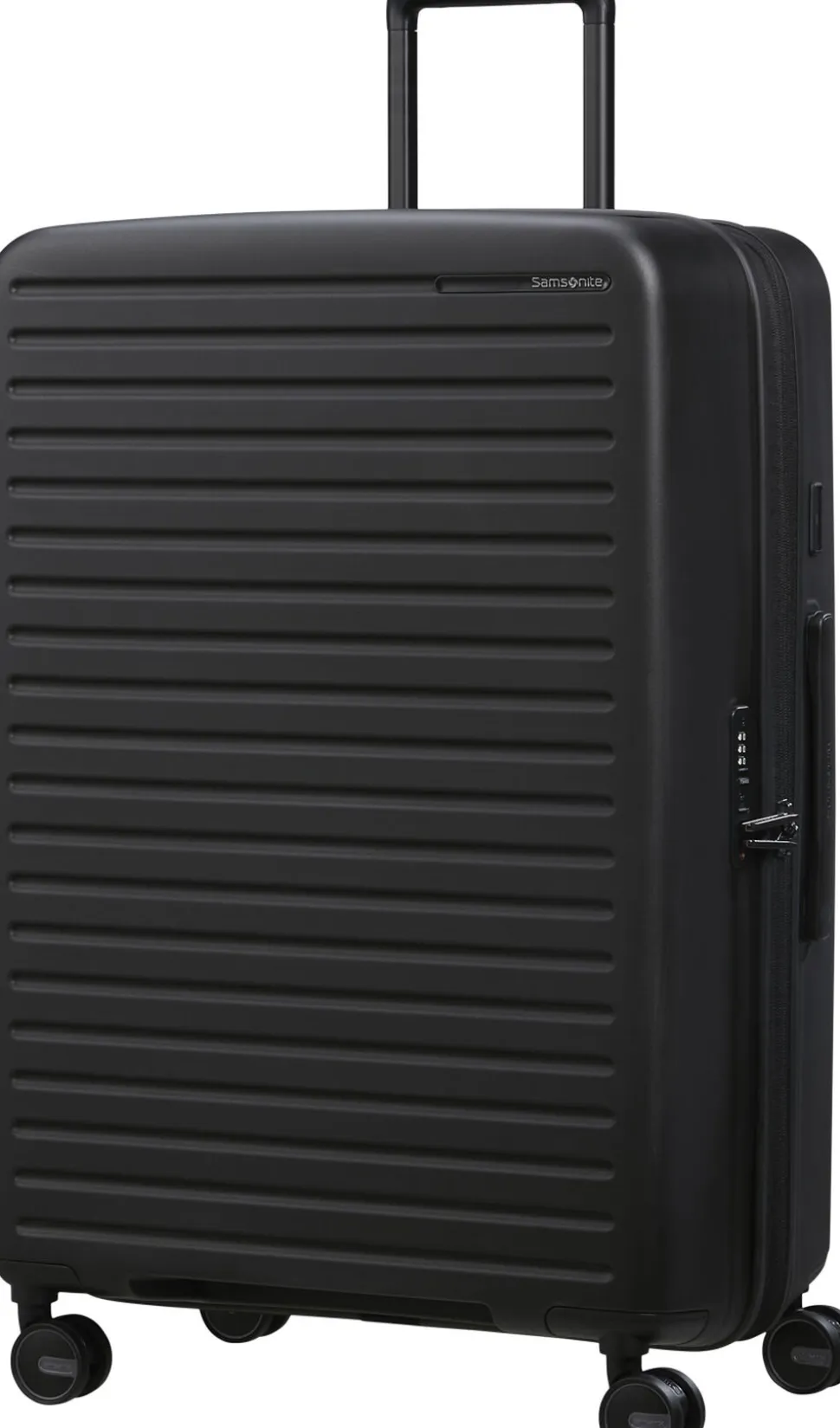 Kuffert med mulighed for udvidelse,indeholder 3 pakkeposer, mulighede for personalisering med de medfølgende stickers, polypropylen,4 hjul,TSA lås , indvendig stofforring lavet af genbrugte plastflasker, dobbelt trollystativ,navneskilt, vægt 3,9 kg,rumindhold 99/109 l, 5 års garanti,75x51x29/32 cm.