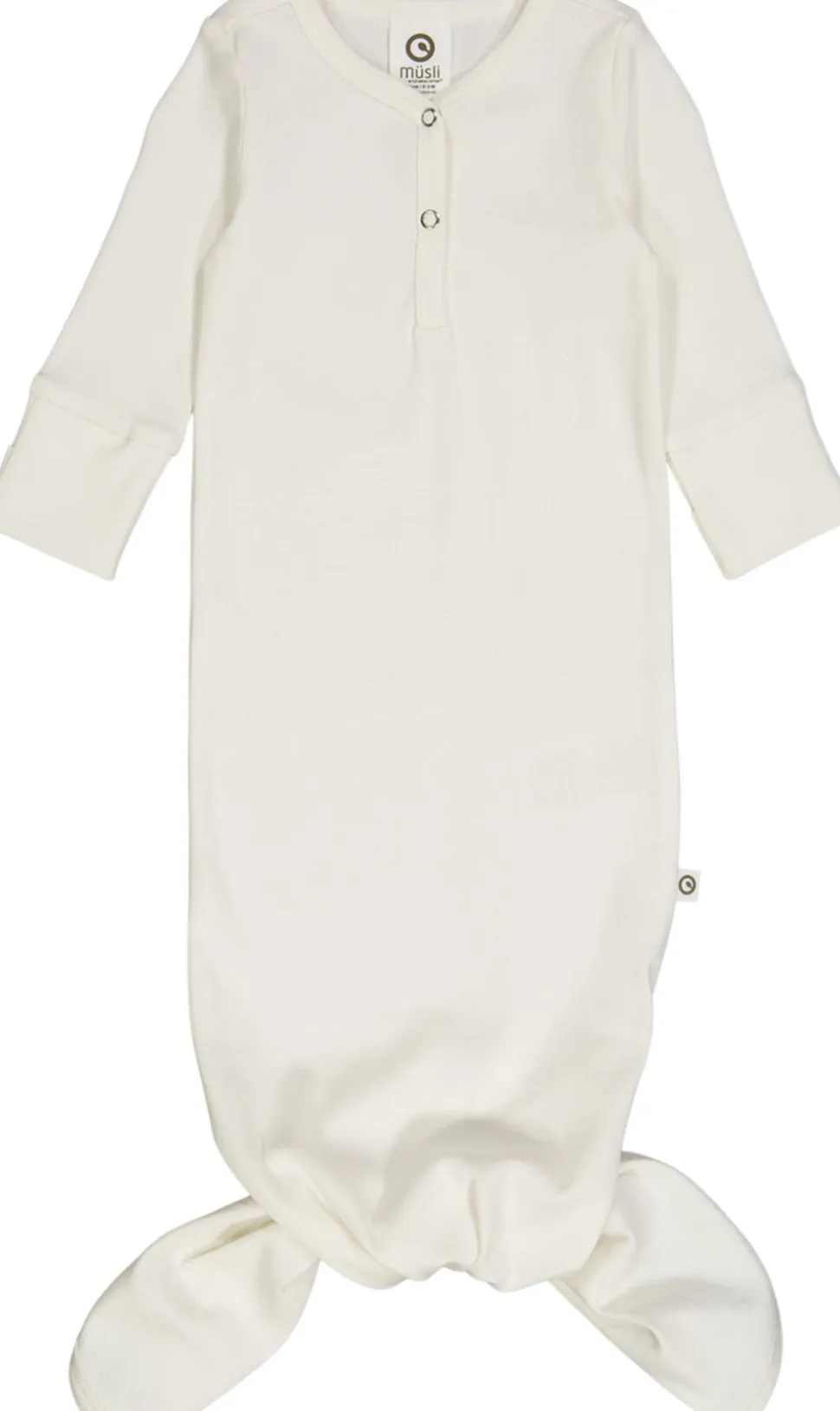 Skøn og blød ribbet soveposedragt med knude lukning i bunden Knuden ved den lilles fødder gør det nemt med hyppige bleskift. Specielt smart om natten hvor man ikke vil vække baby mere end højest nødvendigt. Der er ydermere vendbare hænder, så man kan holde babys hænder inde i dragten. Brug den til at give ekstra tryghed, som sovepose en varm sommerdag, eller hvor den passer ind for jer. Den tilpasser sig barnet, og giver en omsvøbende effekt. Ribstrikken giver en dejlig elastisk fornemmelse, der smyger sig om baby og holder formen. Fremstillet i bomulds-rib med elastan for bedst mulig pasform og komfort. (GOTS Organic Certified by Ecocert Greenlife Lic. No. 152033). Produktet er GOTS organic- certificeret, hvilket betyder at bomulden er certificeret økologisk, og at der i alle andre processer som farvning, strikning og syning er taget de strengeste hensyn til miljøet. GOTS er internationalt anerkendt som den førende standard for forarbejdning af tekstiler af økologisk bomuld. Derudover tages der også hensyn til arbejdsforholdene, hos dem der producerer tøjet. Økologisk bomuld 95%, Elastan 5%