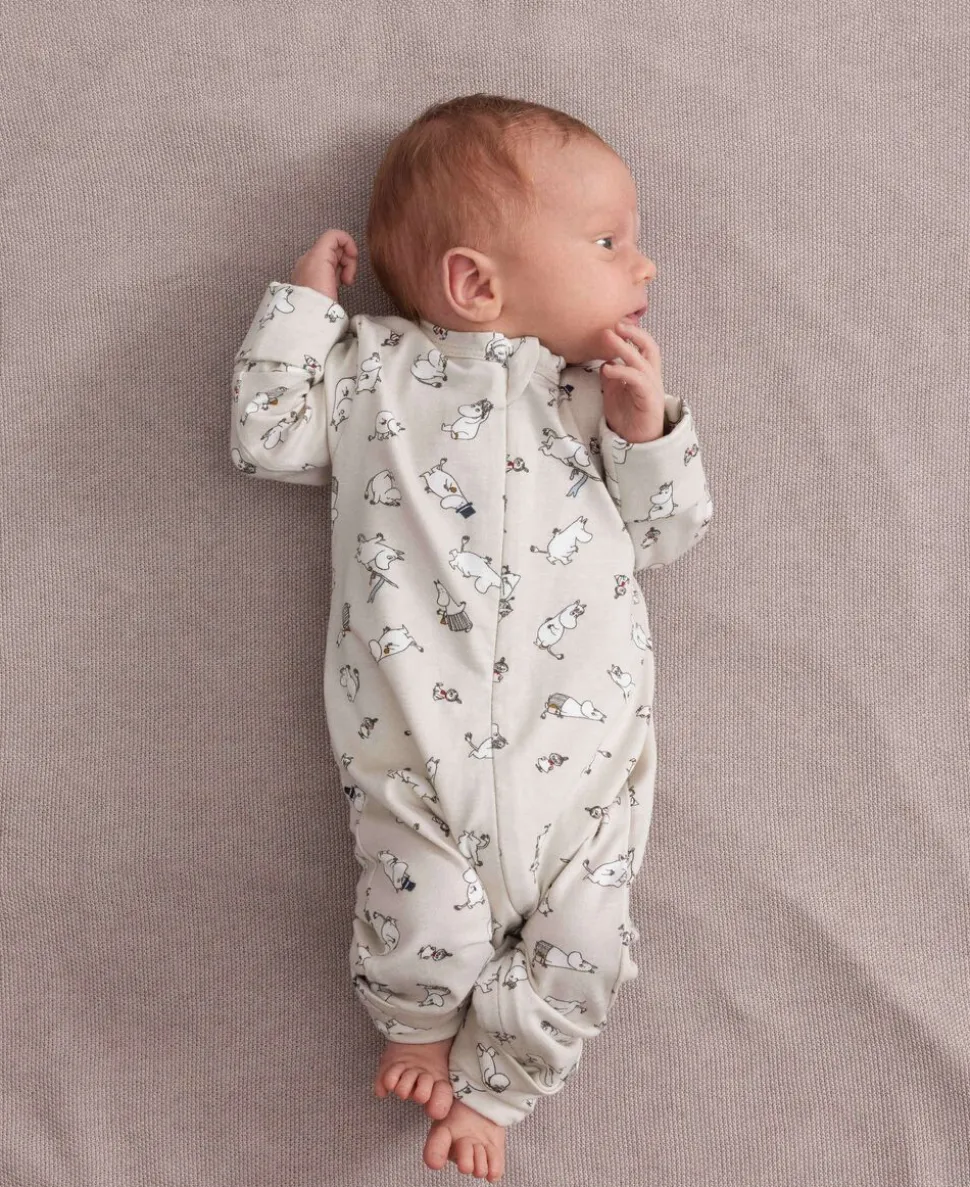 Enkel langærmet heldragt med sødt Moomin print, der kan lynes helt fra hals og ned langs det ene ben med lynlås for nem bleskiftning. Heldragten har ombuk ved både ærmer og ben, som kan justeres i takt med barnets væks. Heldragten har ydermere foldbar vante/strømpe funktion fra str. 2-4M. Heldragten er både blød, holder form og farve og har elastan i sig som gør den strækbar og behagelig at have på.