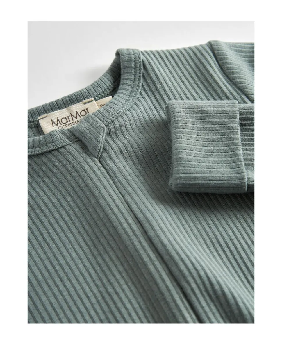 Enkel langærmet heldragt der kan lynes helt fra hals og ned langs det ene ben med lynlås for nem bleskiftning. Heldragten har ombuk ved både ærmer og ben, som kan justeres i takt med barnets væks. Heldragten har ydermere foldbar vante/strømpe funktion fra str. 2-4M. Heldragten er ribstrikket, blød, strækbar og behagelig at have på.