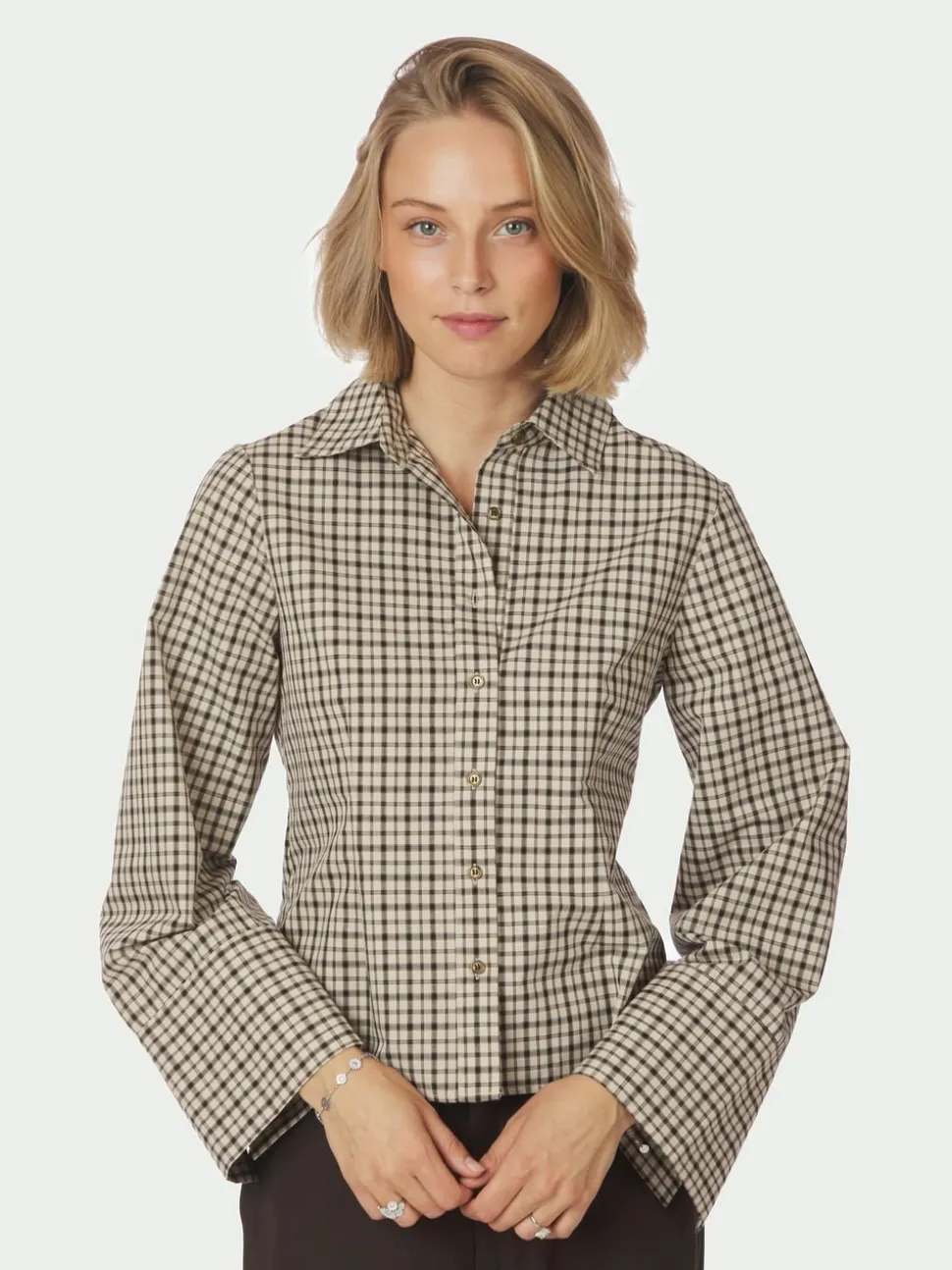 Ternet skjorte med brede ærmer og manchet. Skjorten kommer i en lækker bomuldskvalitet. Modellen er 176 cm og er iført størrelse 36.