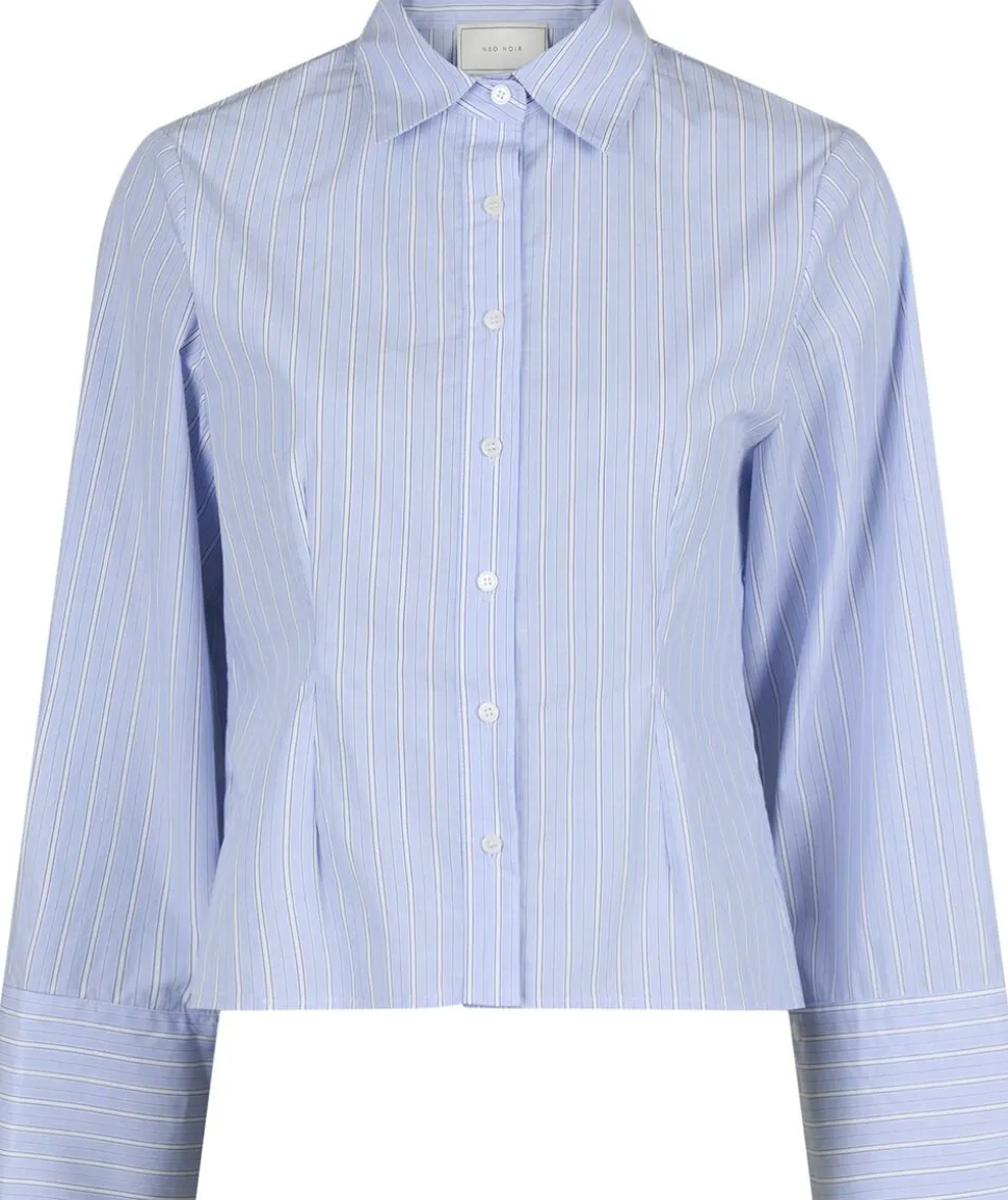 Stribet skjorte med lange ærmer. Skjorten har en klassisk krave, brede ærmer og lukkes med knapper langs fronten. Den er lavet i bomuld og har en tætsiddende pasform. Modellen er iført størrelse 36.