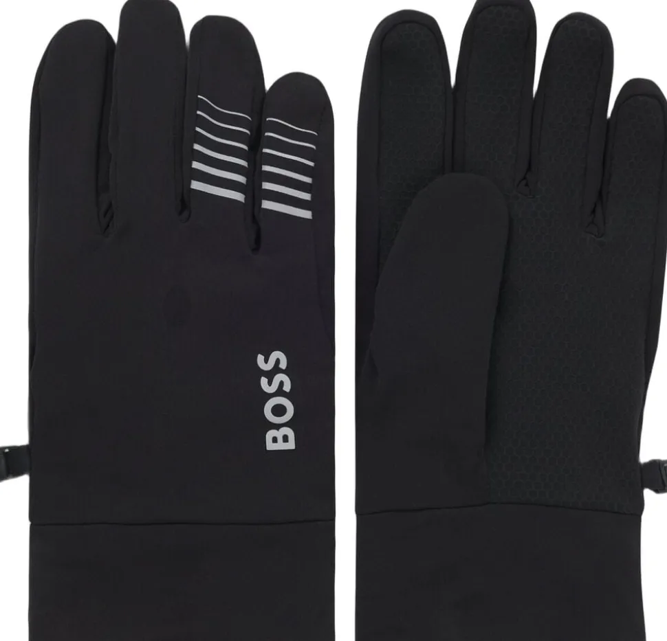 Disse løbehandsker fra BOSS herretøj giver optimalt greb og touchskærmsvenligt Design. Fremstillet i let fleece med stræk. Dekorative reflekterende detaljer. Tilslutning af clips til opbevaring