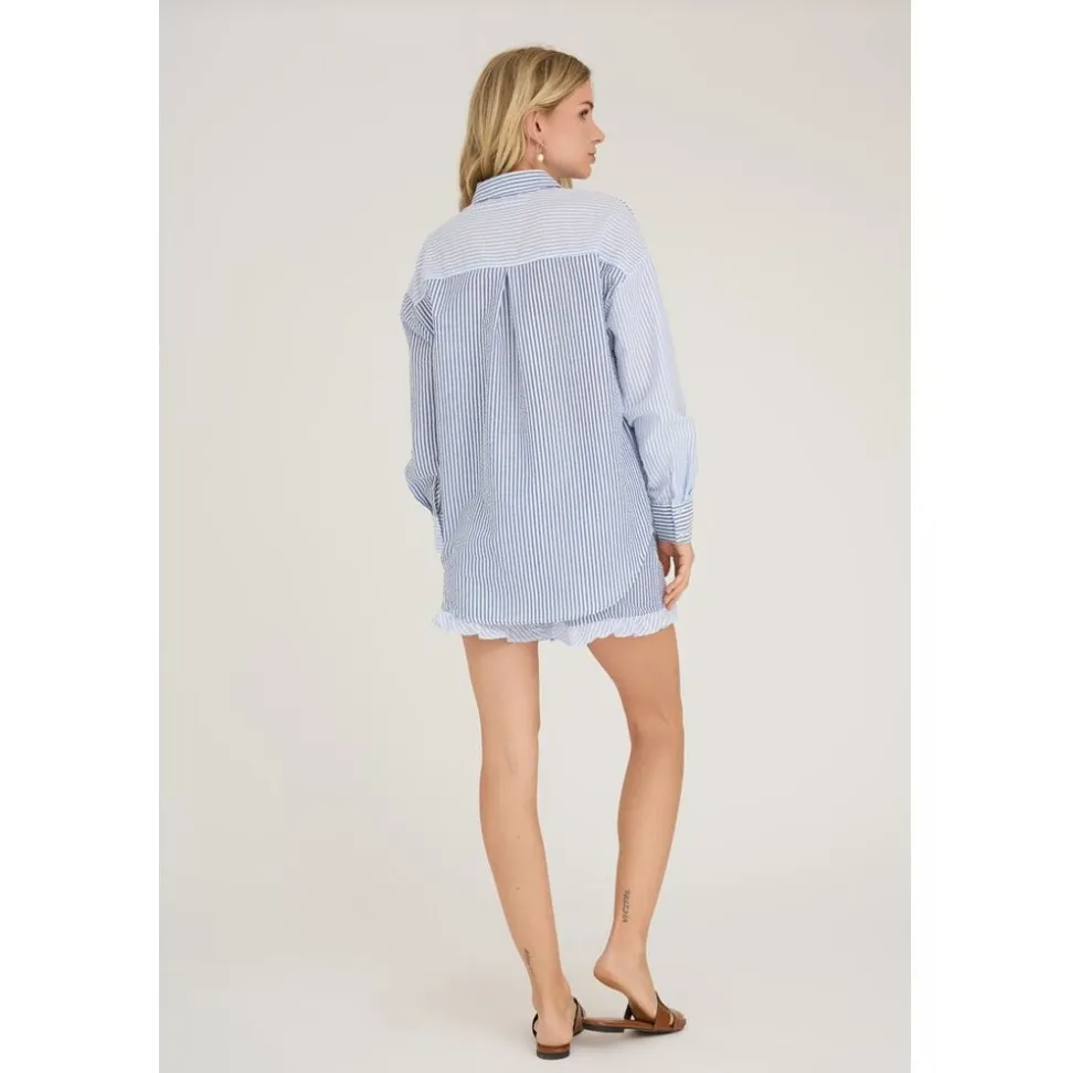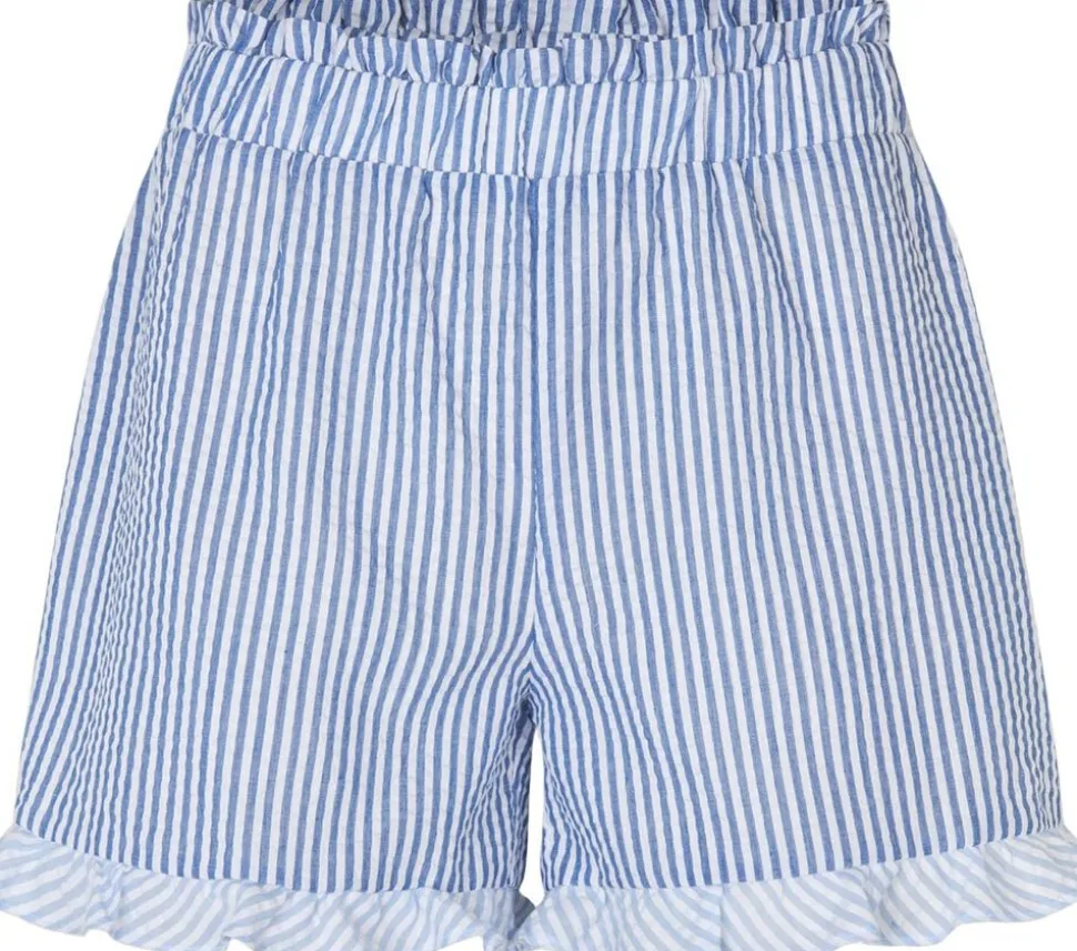 Salvador shorts er korte, Løs shorts lavet af seersucker stof. De har bred elastisk linning og flæser ved sømmene. Shortsene passer til størrelsen. – Løs shorts – Seersucker