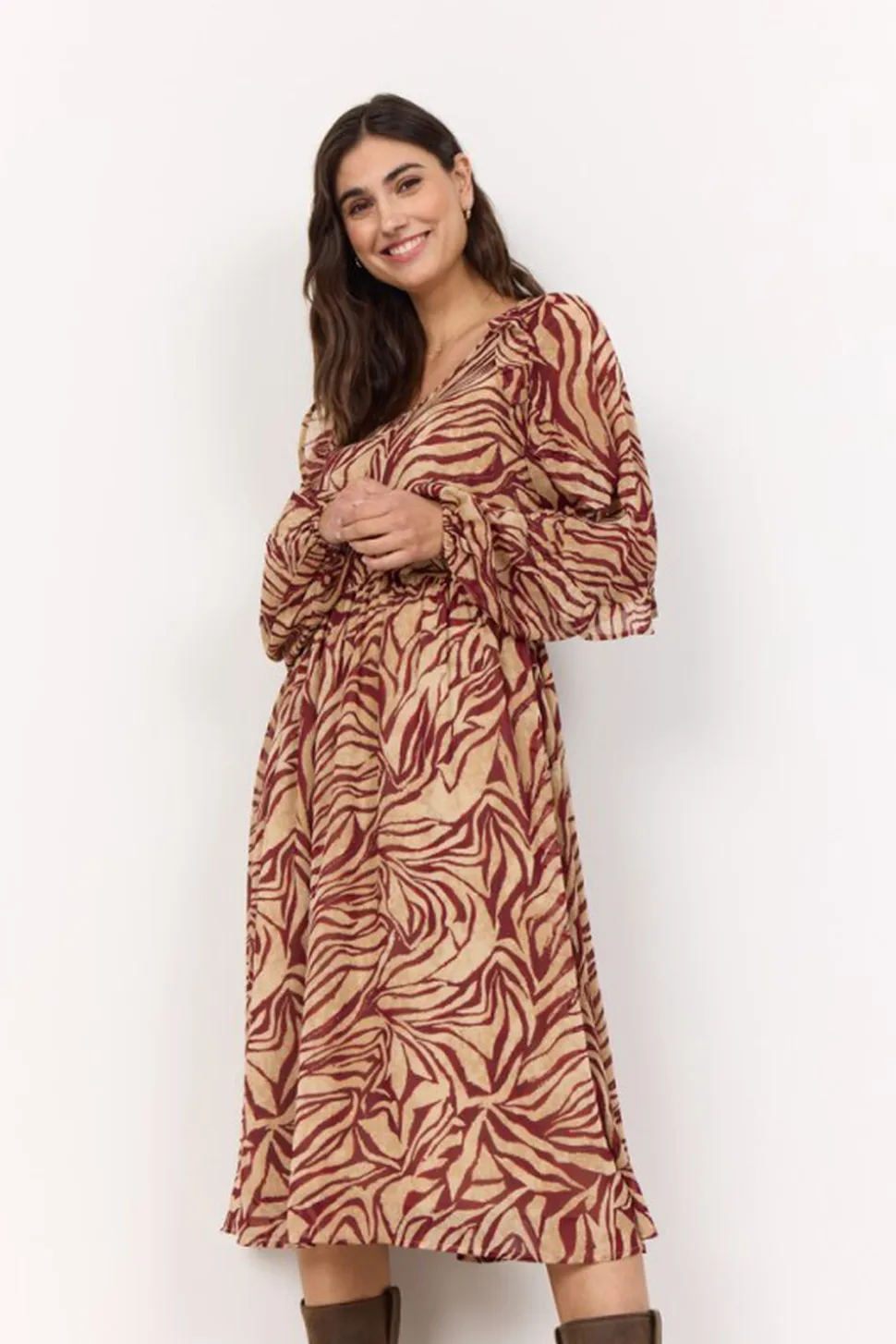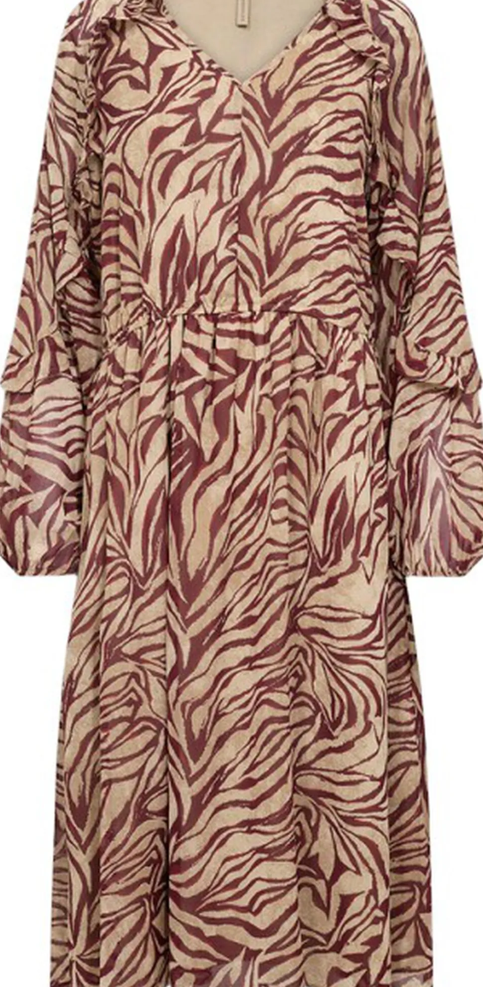 SC-VALBORG 2 Dress er fremstillet af 100 % genbrugspolyester. Den har V-udskæring, lange ærmer med rynkede manchetter og en afslappet, halvlang pasform med et dristigt, abstrakt print. Sæt den sammen med ankelstøvler og en crossbody-taske for et stilfuldt look.