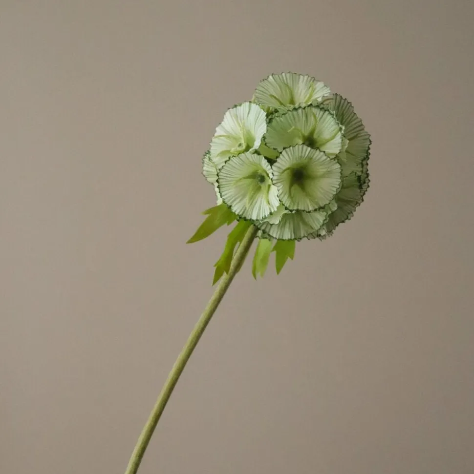 Denne lysegrønne scabiosa-podblomst har delikate, afrundede frøkapsler med en diskret grøn nuance og fine, mørkekantede detaljer. Bælgene er arrangeret på slanke, lysegrønne stilke og når en højde på 57 cm. Den store keramiske jordvase på billedet måler 30,5 cm i højden og 10 cm i diameter.