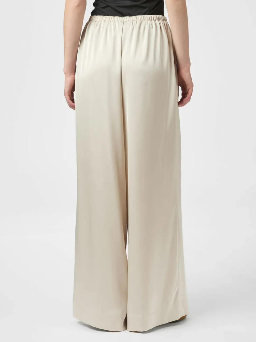 Satinbukser med brede ben. Bukserne har en mellemhøj talje, elastik og justerbare snører i taljen samt sidelommer. De har en almindelig pasform. Modellen er iført størrelse 36.