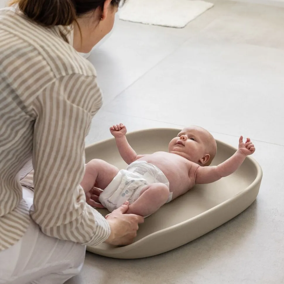 Den babynest-lignende form med høj kant vil hjælpe til med at forhindre, at dit barn triller ned fra puden. Den bløde kant sikrer samtidig, at det aktive barn, som er i bevægelse under bleskiftet, ikke slår hovedet imod en hård bagvæg eller puslebordets kant.