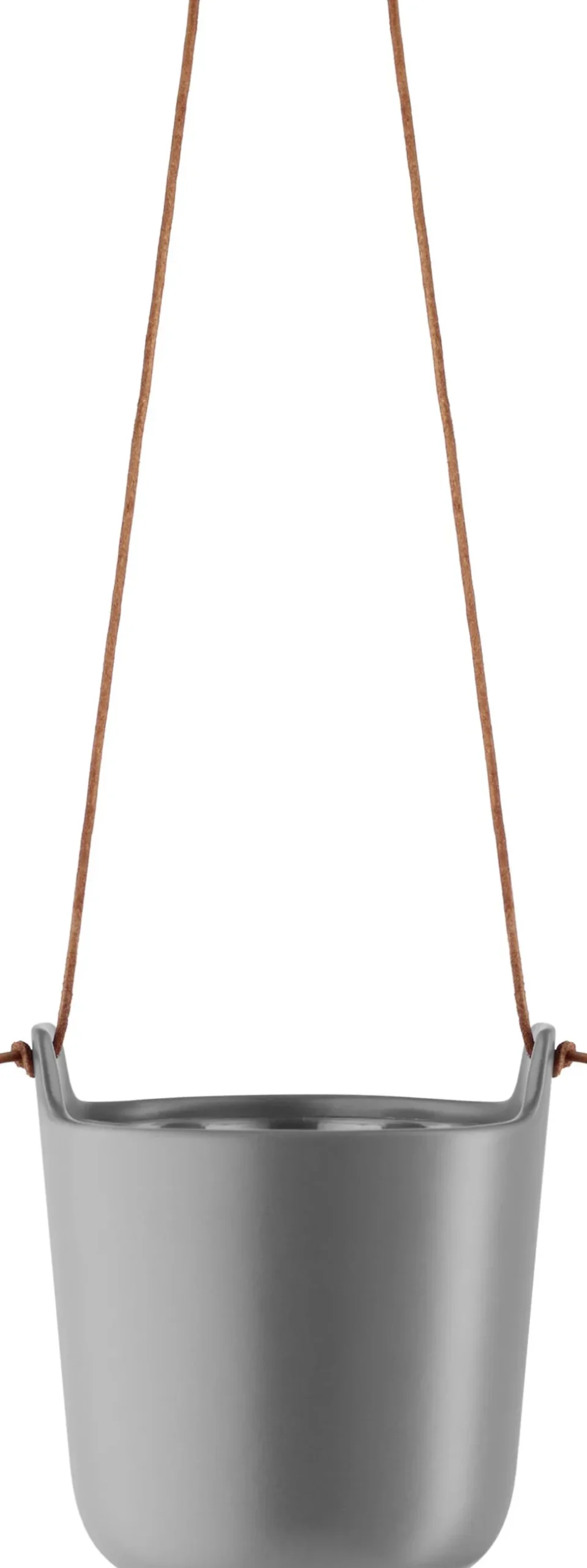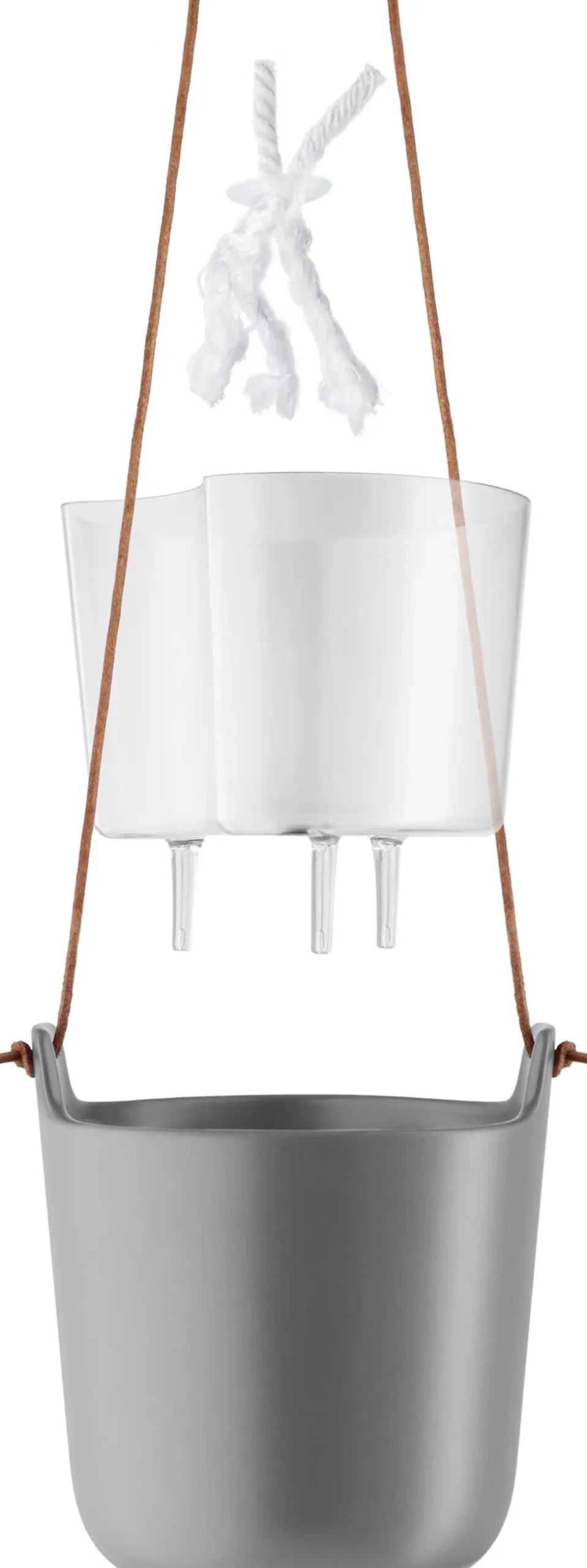Selvvandende, dekorative urtepotter i mat stentøj og med lædersnor til ophæng. Et organisk design, som med urtepottens selvvandende system giver de optimale vækstbetingelser for krydderurter og blomster. Ved hjælp af nylonvæger i bunden af den øverste potte og et vandreservoir i den nederste potte kan planten selv suge den mængde vand, den har brug for. Planteindsatsen i plast er udformet med en vandingskanal, der gør den nem at påfylde.