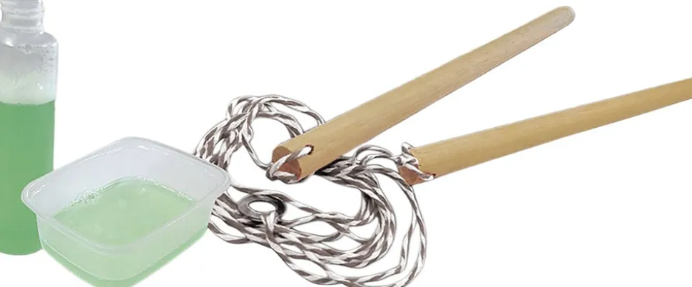 Nu kan du lave megastore bobler ved hjælp af håndværktøjet og en superstærk sæbeopløsning. Hold stængerne sammen, og dyp rebet i sæben. Løft stængerne op igen, og træk dem forsigtigt fra hinanden. Når du synes, boblen er stor nok, skal du sætte stængerne sammen igen. Nu har du en megaboble. Sæbeopløsning i flaske, 200 ml