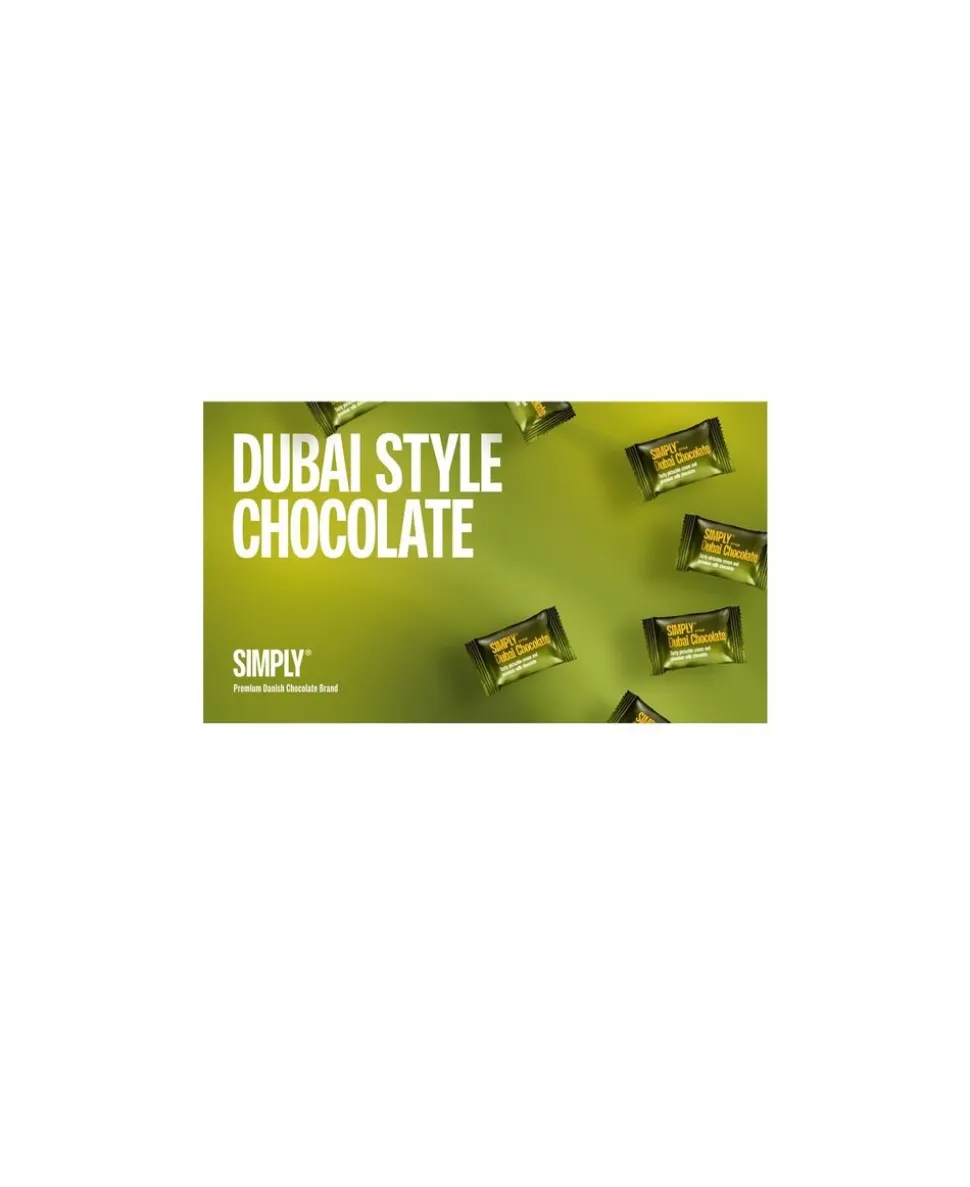 SIMPLY Dubai Style Chocolate Box Premium mælkechokolade fyldt med knasende pistaciecreme. Æske med 15 stk. Simply Dubai Style Chocolate Bites A taste of a different world! Oplev en verden af luksus med Simplys egen naturlige opskrift på den efterspurgte Dubai-chokolade. Med nøje udvalgte ingredienser har vi skabt den lækreste opskrift på en cremet pistaciecreme blandet med økologiske, knuste, sprøde majs overtrukket med premium mælkechokolade. Som alt andet chokolade, vi producerer, er denne lækkerbidsken selvfølgelig også lavet uden brug af kunstige aromaer, sødemidler og farvestoffer. I denne fine æske får du 15 enkeltindpakkede, mundrette chokolader lige til at dele eller nyde for dig selv. Glæd dig – den smager himmelsk! 150g (15 x 10g)