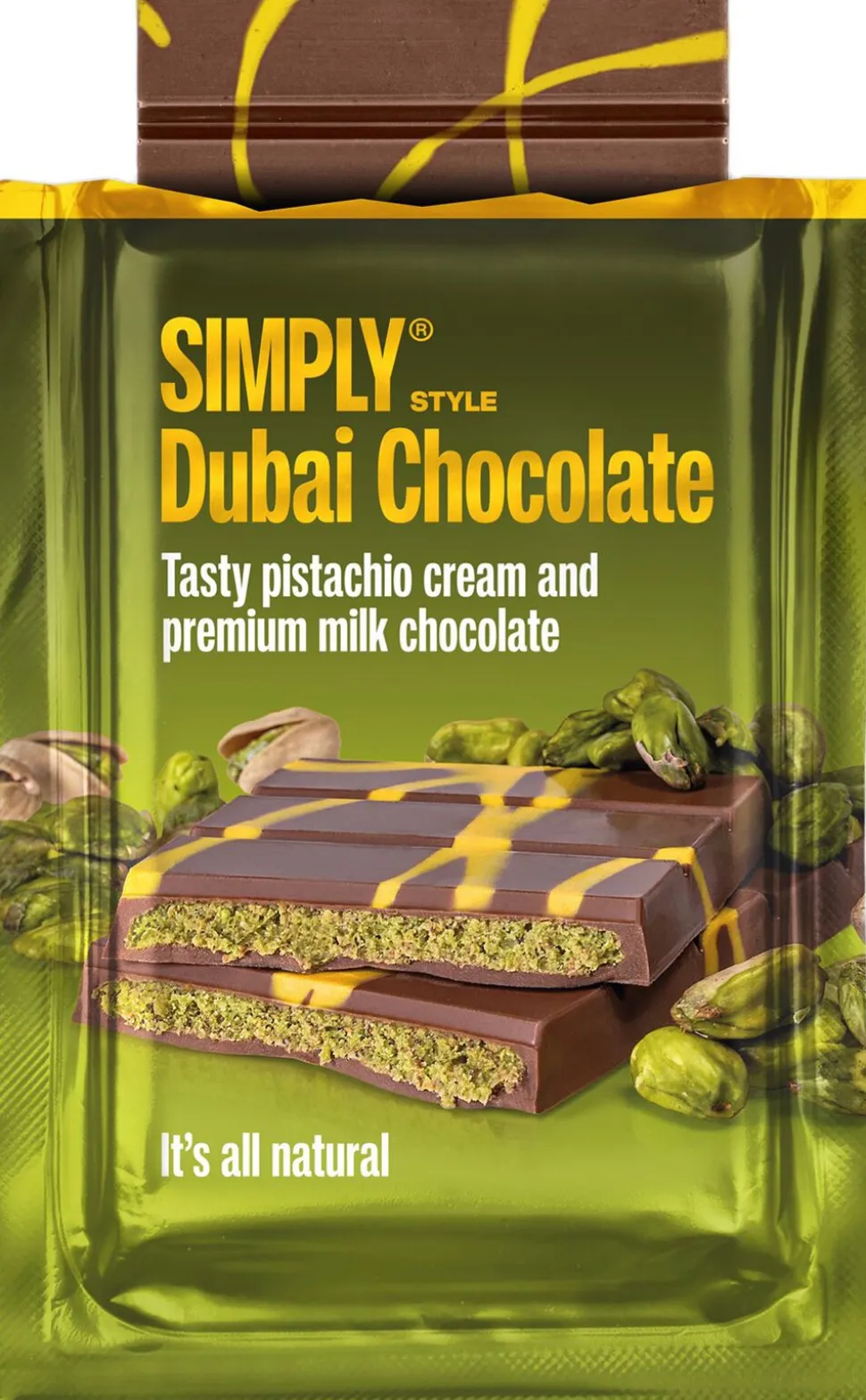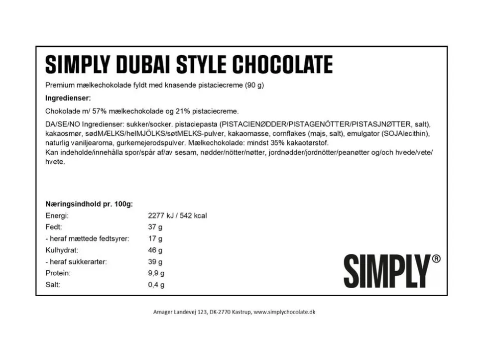 Premium mælkechokolade fyldt med knasende pistaciecreme. Oplev en verden af luksus med Simplys egen naturlige opskrift på den efterspurgte Dubai-chokolade. Med nøje udvalgte ingredienser har vi skabt den lækreste opskrift på en cremet pistaciecreme mixet med økologiske, knuste, sprøde majs overtrukket med premium mælkechokolade. Som alt andet chokolade, vi producerer, er denne nyhed selvfølgelig naturlig uden brug af kunstige aromaer, sødemidler og farvestoffer. Glæd dig – den smager himmelsk! men du skal være hurtig – vi har kun produceret en begrænset mængde. * Limited edition * Kun naturlige ingredienser * Produceret i Danmark