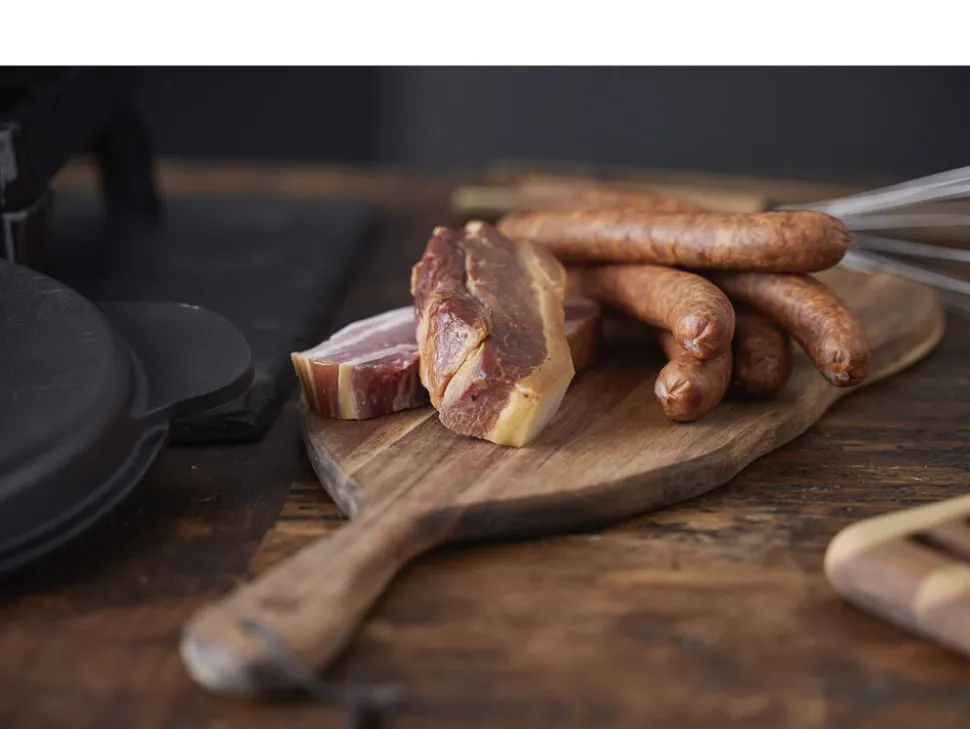 Serveringsbræt med bløde organiske former fremstillet i akacietræ. Brættet er ideelt til servering af ost, tapasretter og andre anretninger eller som skærebræt under tilberedning af måltidet. Med ophængshul og strop. 44 x 22,7 x 1,5 cm. Varen er produceret i akacietræ.