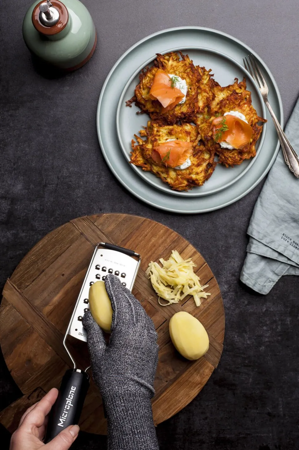 Den er udviklet specielt til at beskytte hænderne mod Microplanes skarpe skær. Handsken er både velegnet til højre- og venstrehåndede og kan vaskes i både opvaske- og vaskemaskinen.