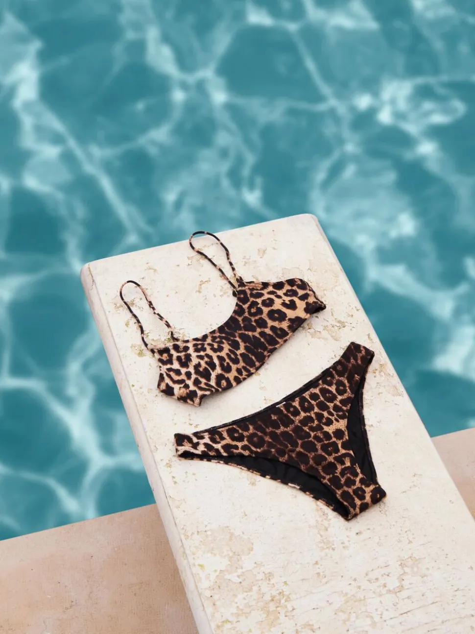 Bikinitrusser med leopardprint. De er lavet i et materiale med stretch og struktur. Trusserne er medium dækkende bagpå og har almindelig talje. Modellen er iført størrelse S.