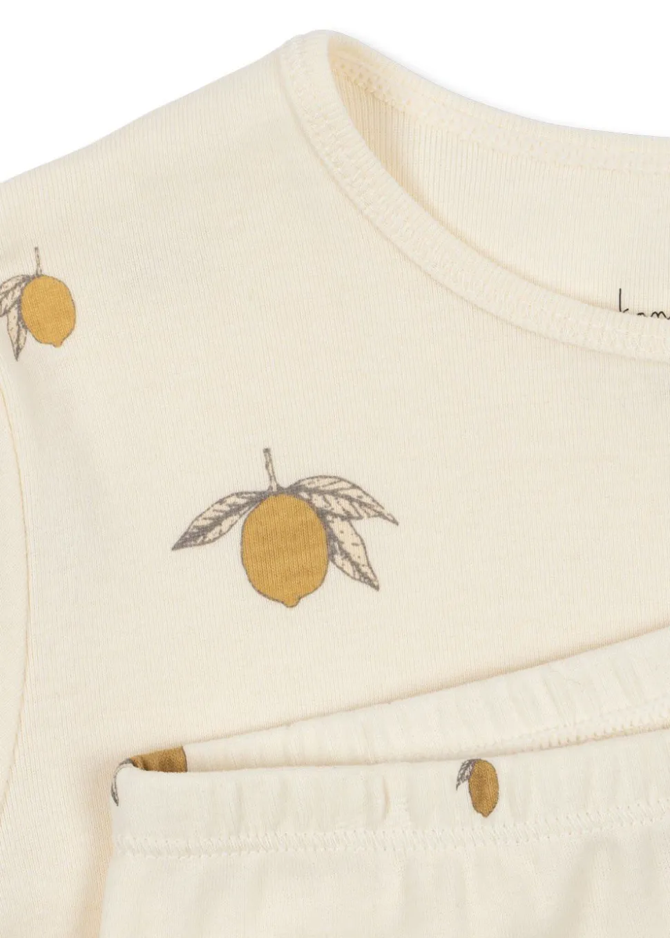 2-delt pyjamas fremstillet i 100% økologisk bomuld. Designet med bløde elastiske manchetter ved ærme- og benåbninger. Bukserne har en elastisk talje.