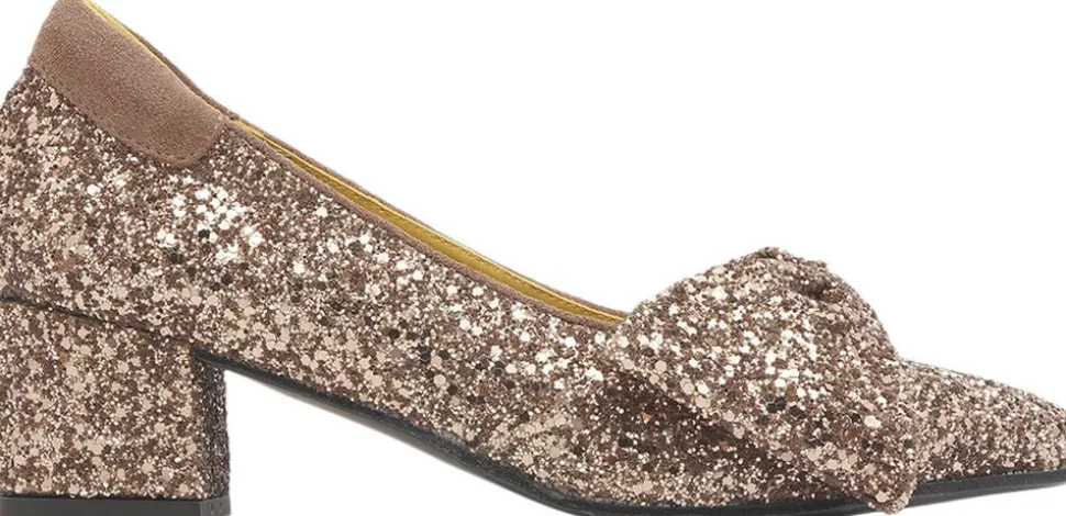 Sløjfepump i funklende glitter. Pumpen har en spids snude, ruskindskanter, polstret krave for ekstra komfort og støtte, vatteret indersål, læderfoer, sort tunitsål og en