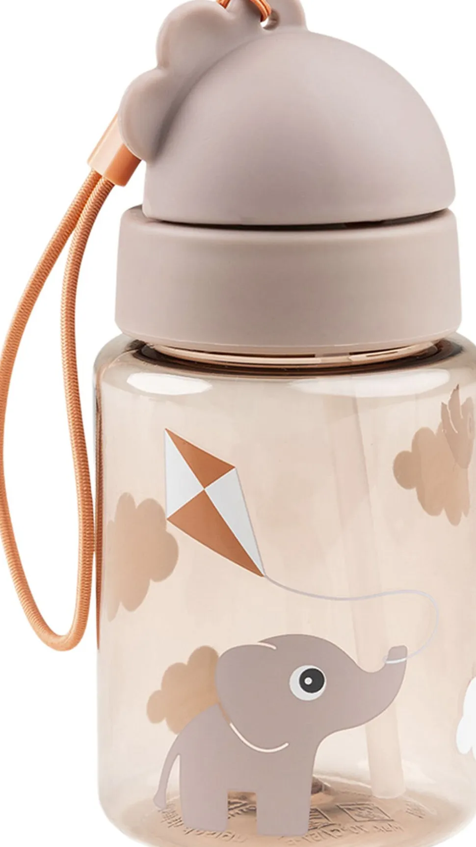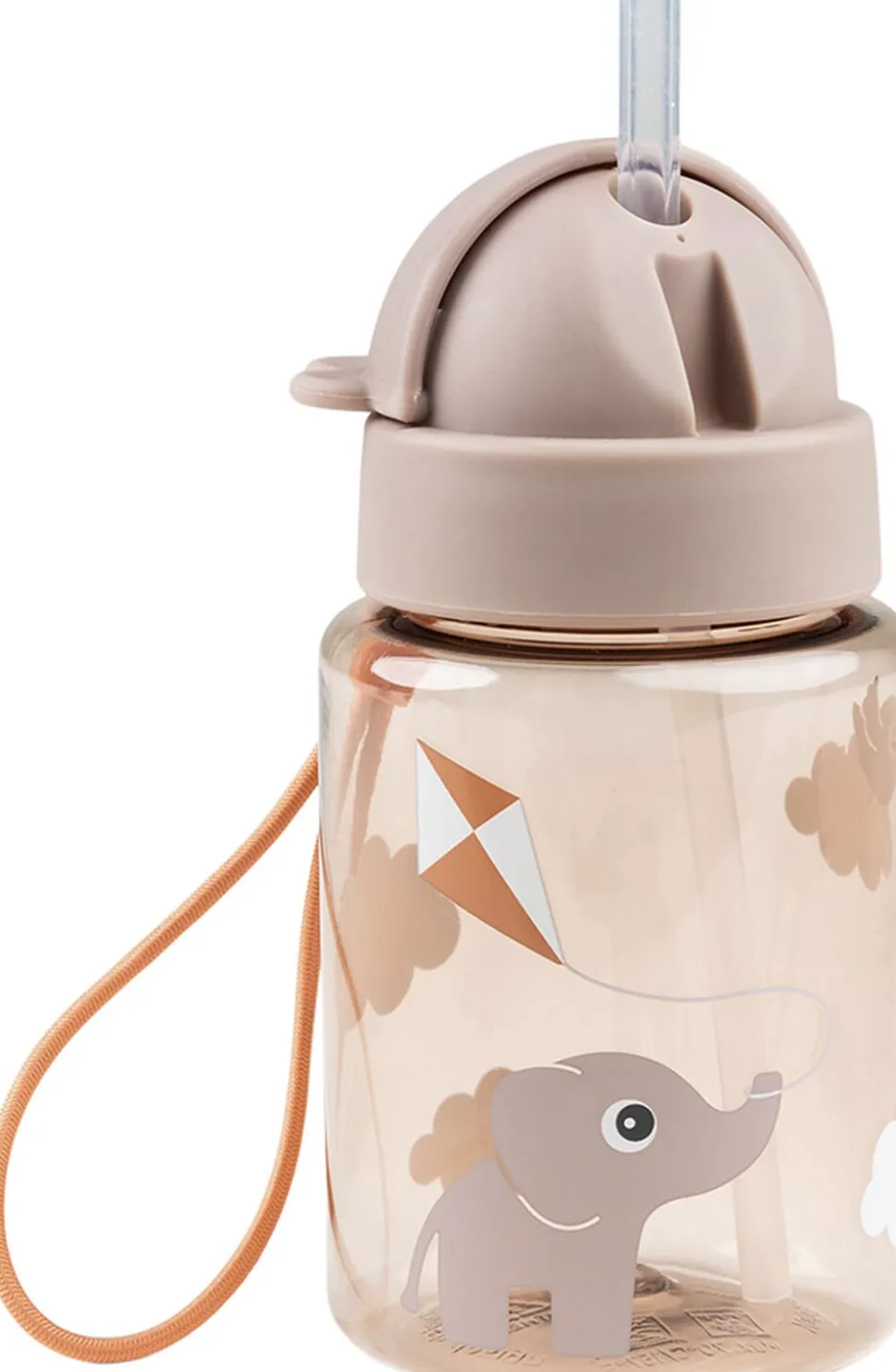 Den gennemsigtige, pudderfarvede flaske har et praktisk sugerør, der kan foldes ind og forhindrer væske i at løbe ud