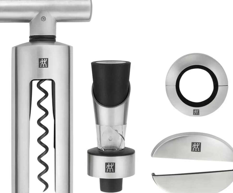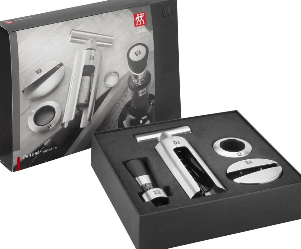 Den elegante gaveæske indeholder: proptrækker, dekanteringsprop, folieskærer og dråbefanger