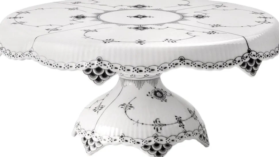 Den Sort Musselmalet Halvblonde fad på fod er et smukt bud på en gammel klassiker fra Royal Copenhagens arkiv. De udsmykkede blondedetaljer, der falder elegant ned fra kanten og bunden, minder om en klassisk dug med blondekant.