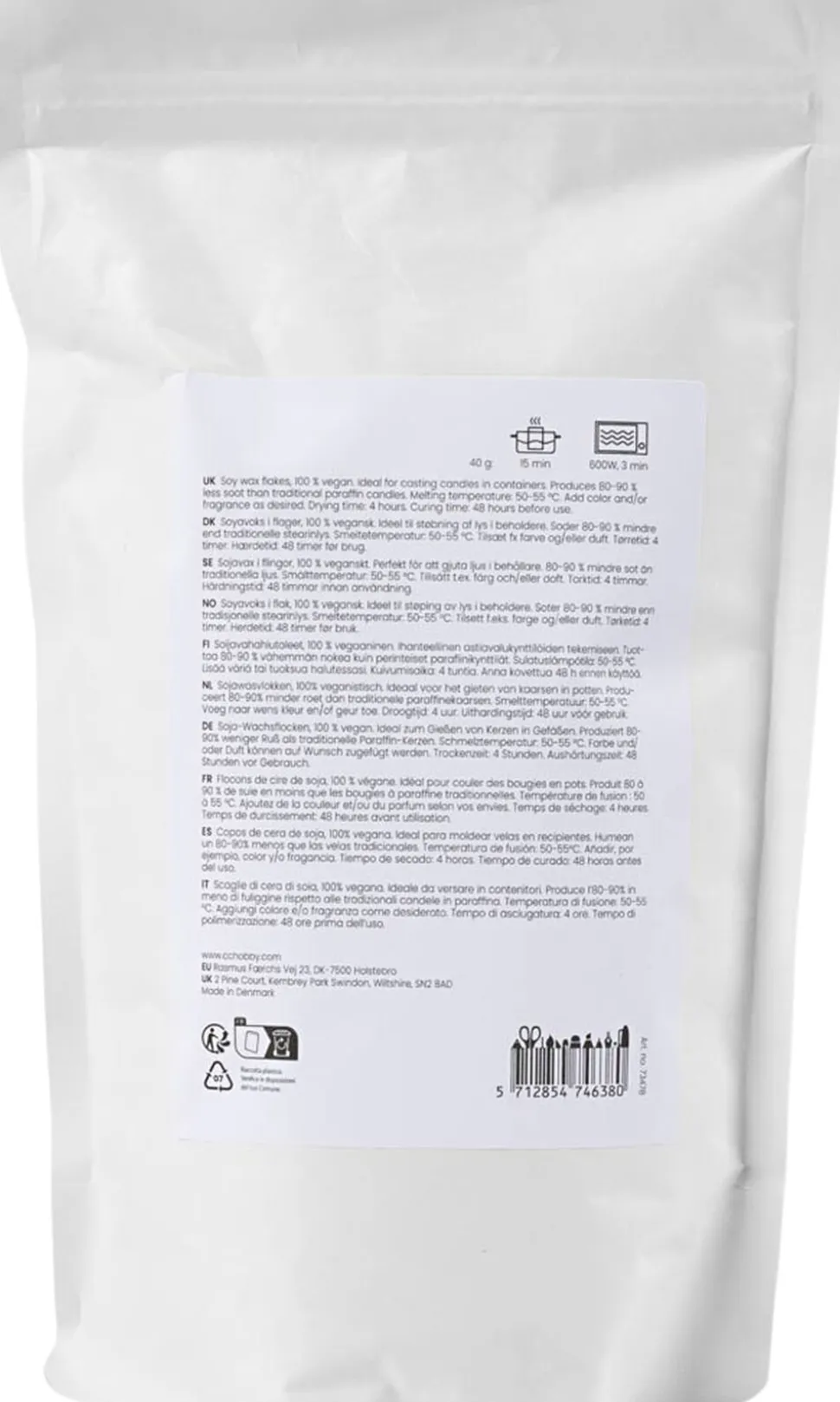 Soyavoks i flager, 100 % vegansk. Perfekt til dig, der vil støbe dine egne lys i beholdere. Soder 80-90 % mindre end traditionelle stearinlys. Smeltetemperatur: 50-55 °C. Tilsæt fx farve og/eller duft. Tørretid: 4 timer. Hærdetid: 48 timer før brug. Med vores sojavoks kan du nemt støbe smukke sojalys i beholdere. Sojavoks brænder helt rent, og soder derfor meget mindre end traditionelle stearinlys. Da voksen kommer i flager, kan du meget nemt doserer den nøjagtige mængde, når du støber. Har du lyst, kan du også tilsætte farve og duft i dine lys. Smelt først voksen i et vandbad (gryde med vand på kogeplade) eller i en mikrobølgeovn ved 80 % styrke med 30 sekunders interval. Bland herefter duft og farve i, og sæt en væge fast i beholderens bund med lidt lim eller flydende voks. Hæld til sidst den smeltede blanding i.