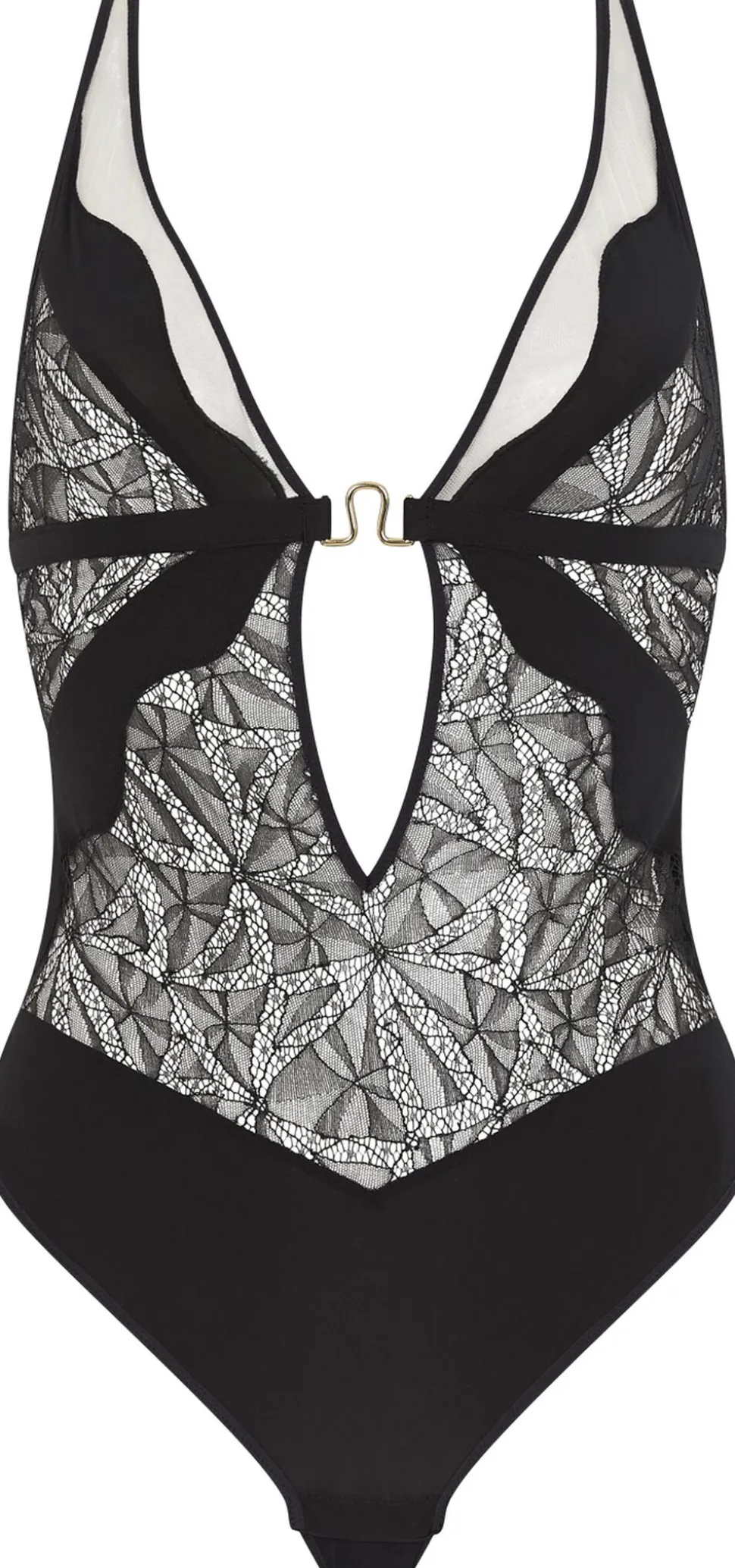 En body fra Chantelle X med dyb halsudskæring, lavet af grafiske Leavers blonder, ugennemsigtig strik og gennemsigtig tyl.