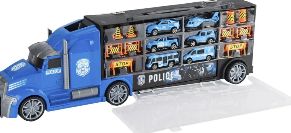 Mega politiautotransporter med 6 køretøjer og tilbehør I plast Med bærehåndtag og smart funktion, hvor bilerne kan køre ud gennem fronten på lastbilen