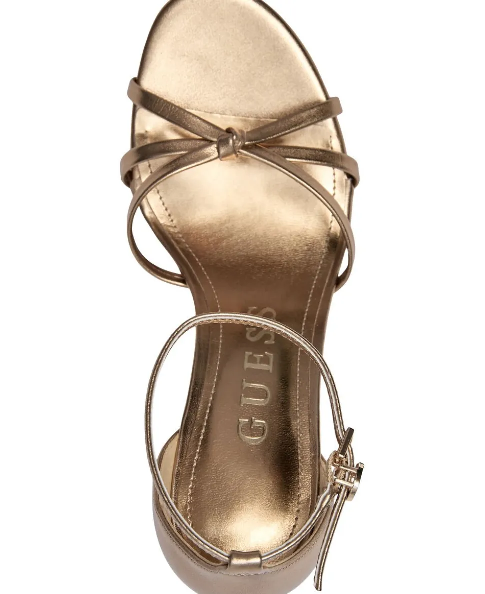 Sandal fra GUESS i en smuk, metallisk kvalitet. Sandalen er enkel i modellen med en høj, tynd stilethæl, en justerbar ankelrem, en lille logodetalje bagpå samt smalle remme, der samles i en knude på fronten. En detalje, der giver en flot effekt.