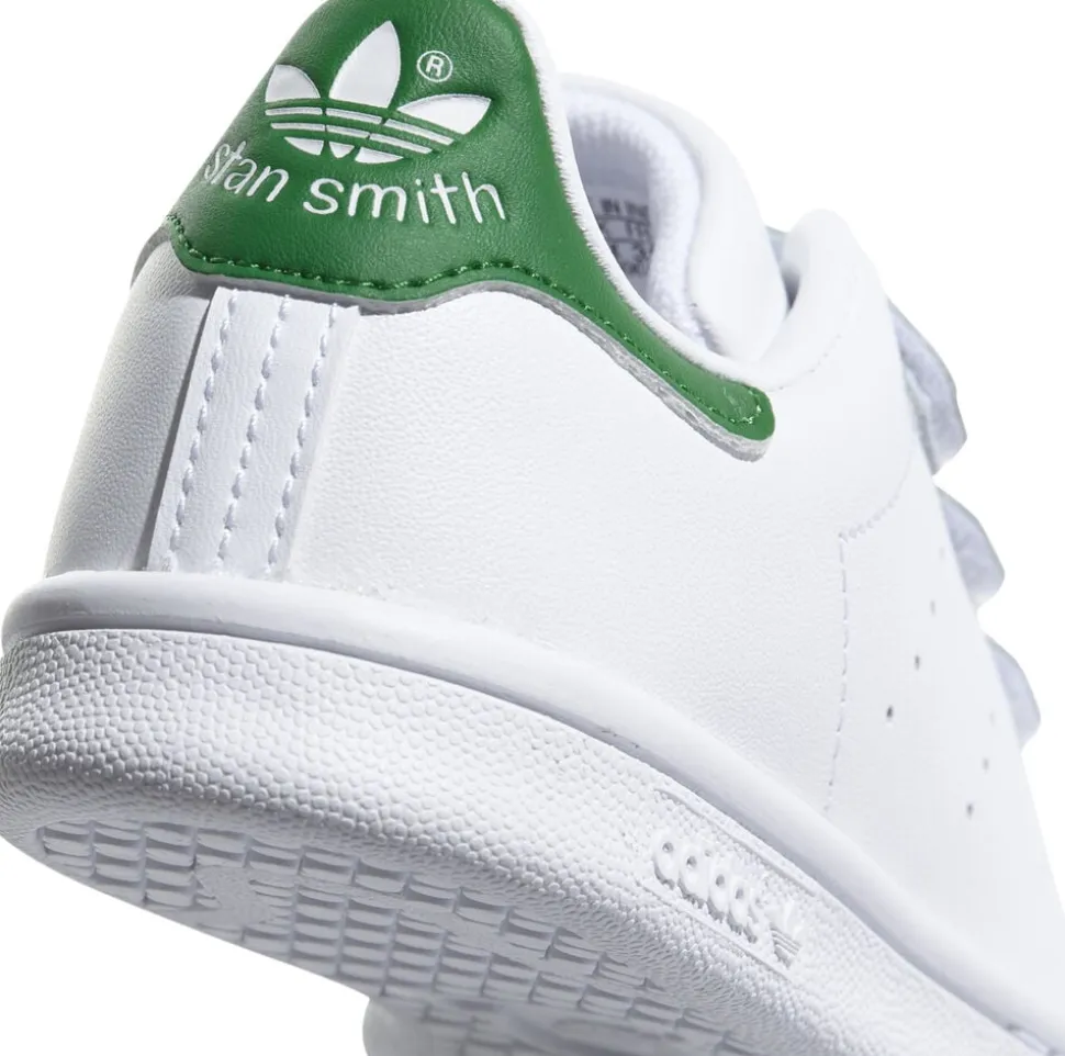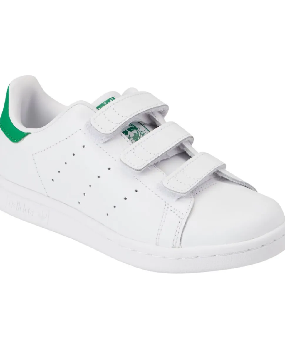 Smarte Stan Smith sneakers fra Adidas. Disse sko er hvide og har grønne detaljer. De har en tyk sål og lukkes med velcro. Med disse sko er barnet sikret komfort. Skoene er ideelle til bevægelse. De kan med fordel bruges sammen med et par bukser.