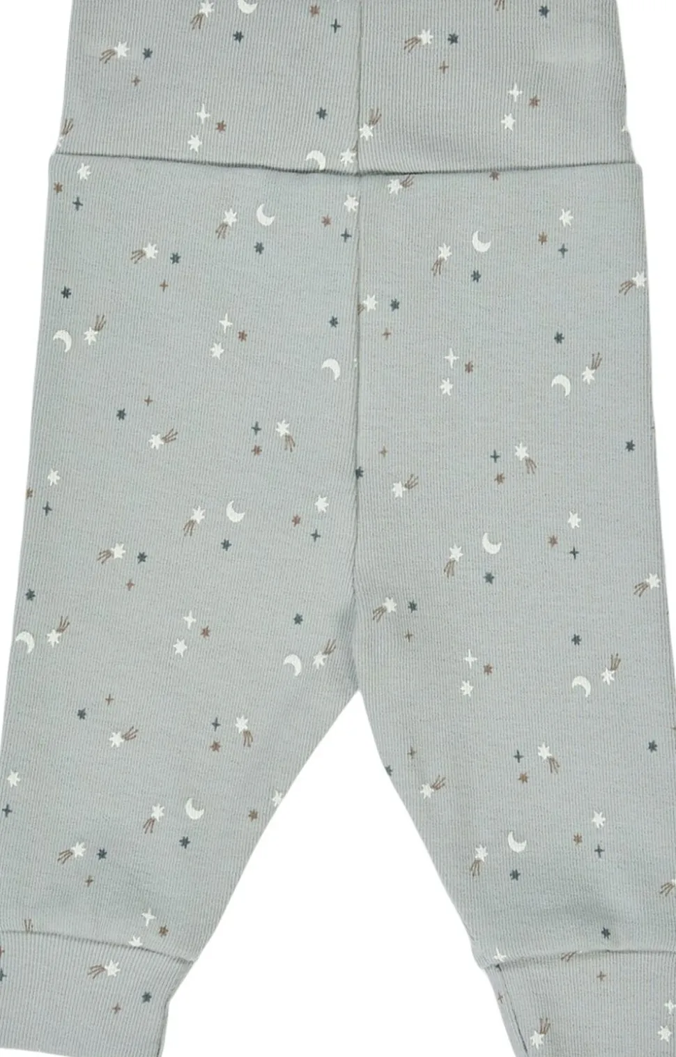 Dejlig bløde bukser til de mindste. Smukt gennemgående print af stjerner. Bukserne har en bred og elastisk kant foroven som kan foldes efter behov og stil. I ben-afslutningen er der foldbare fødder, så du kan folde bukserne så de små fødder ikke bliver kolde. Bukserne er lavet fra str. 44-74 så de passer meget små børn. Fremstillet i dejlig blød bomulds-rib med elastan for optimal pasform (GOTS Organic Certified by Ecocert Greenlife Lic. No. 151714). Produktet er GOTS organic- certificeret, hvilket betyder at bomulden er certificeret økologisk, og at der i alle andre processer som farvning, strikning og syning er taget de strengeste hensyn til miljøet. GOTS er internationalt anerkendt som den førende standard for forarbejdning af tekstiler af økologisk bomuld. Derudover tages der også hensyn til arbejdsforholdene, hos dem der producerer tøjet. Økologisk bomuld 95%, Elastan 5%