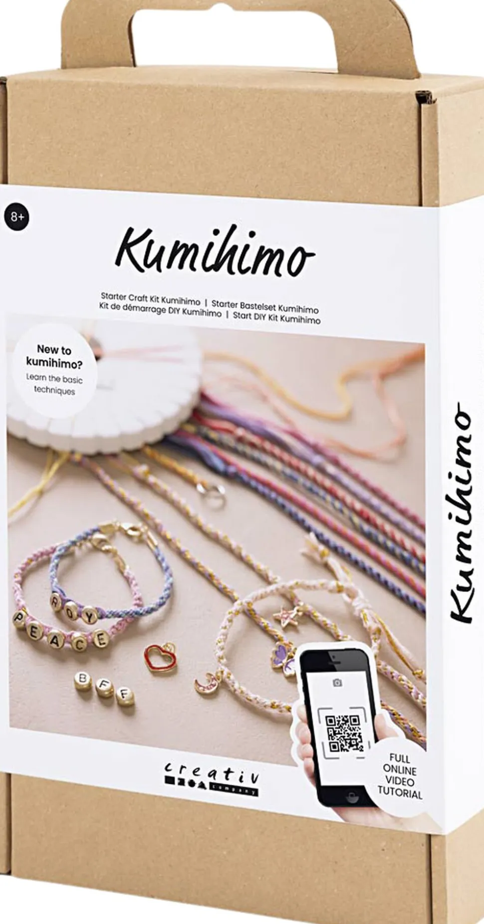 Med dette kit kan du lære fletteteknikken, kumihimo. Indeholder alle de materialer du skal bruge, og al den vejledning du behøver. Vil du lære at flette efter den gamle, japanske kumihimo-teknik, er vores Start DIY Kit perfekt. Det indeholder alt, hvad du skal bruge for at komme godt i gang. Scanner du QR-koden på æsken, bliver du ført direkte ind i vores læringsunivers. Her kan du se videoer, som guider dig igennem fletteteknikken og resultatet bliver de fineste armbånd eller mininøgleringe.