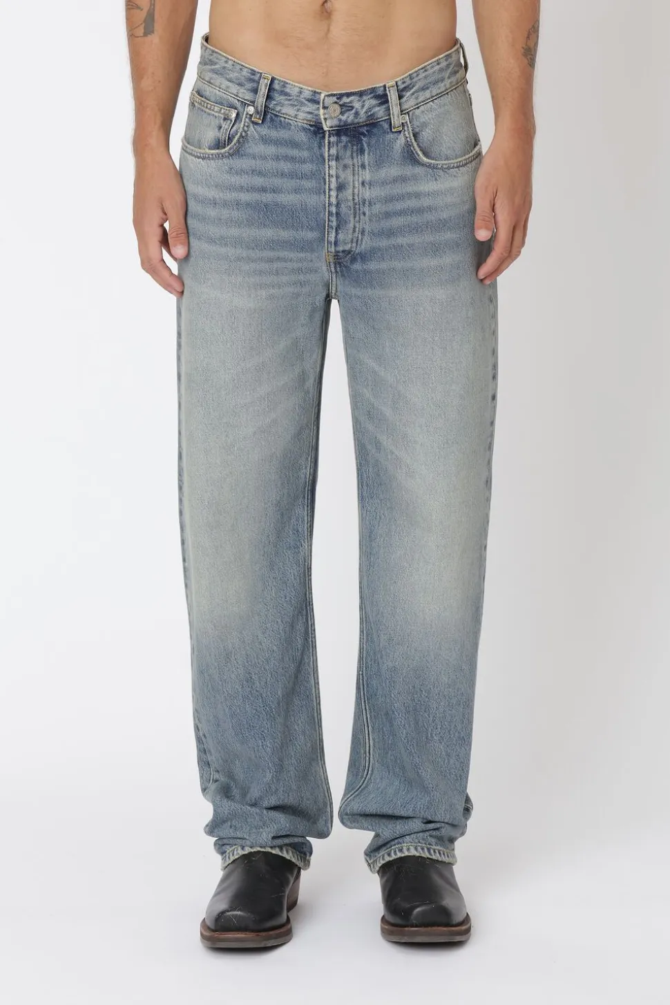 Steve er et par jeans i 90er-stil med løs pasform, mellemhøj talje, knaplukning og et afslappet, lige ben.