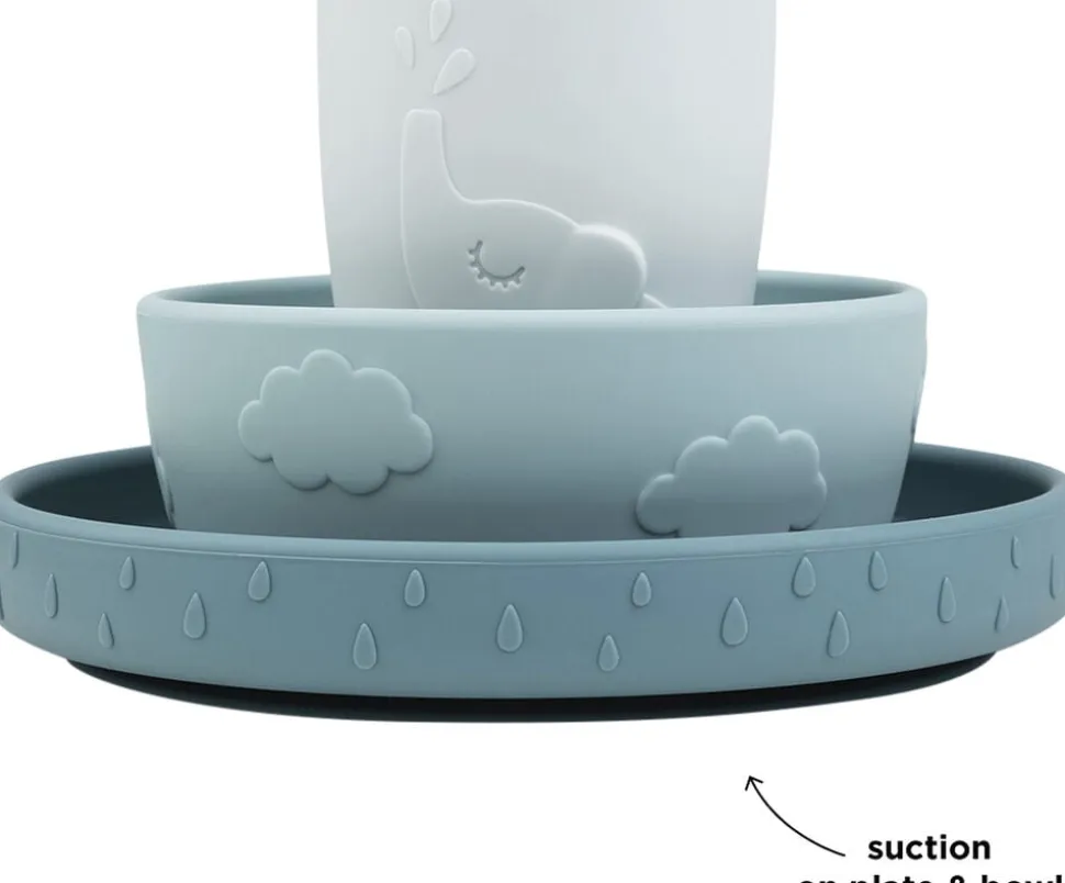 Sugekoppen under tallerkenen og skålen holder servicet på plads under måltidet