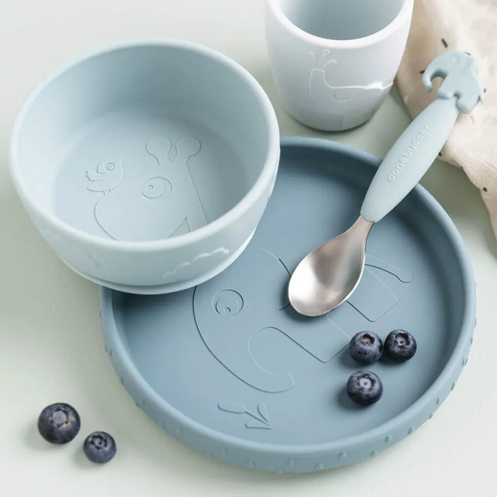 Spisesæt bestående af en tallerken, en skål og en minikop